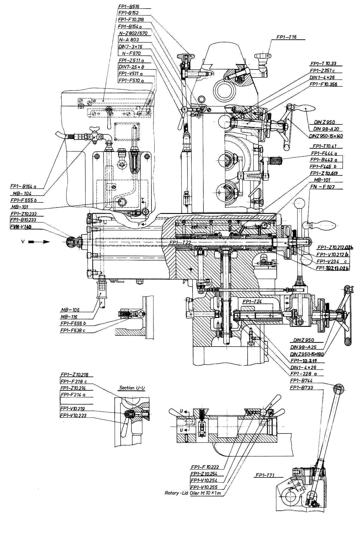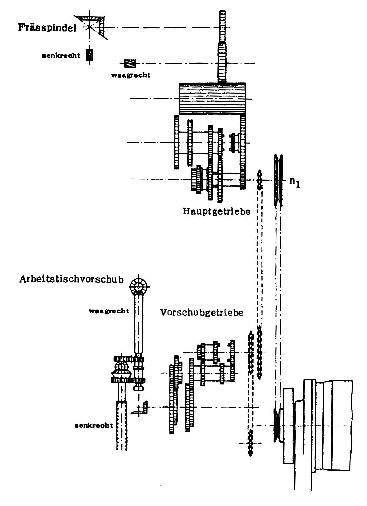 Кінематична схема фрезерного верстата Deckel FP1. Дивитись у збільшеному масштабі