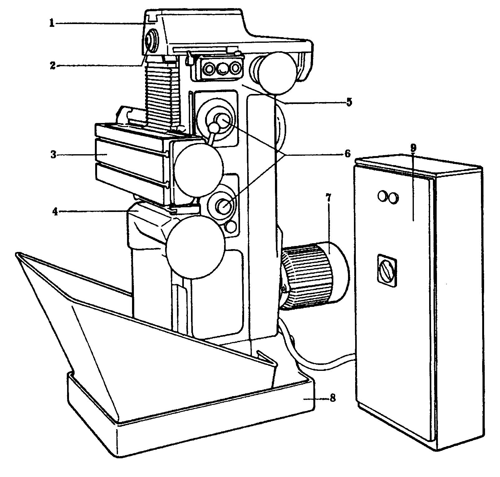 Для фиксирования вертикальной установки робочого стола служит шаровая рукоятка 17. Следует помнить, что при применении вертикальной подачі зажим должен быть отпущен, так как иначе возможно повреждение направляющей суппорта.