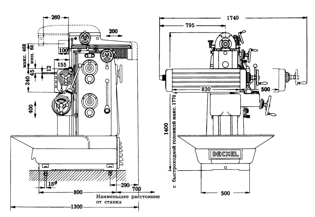 Габарити робочого простору фрезерного верстата Deckel FP2. Дивитись у збільшеному масштабі