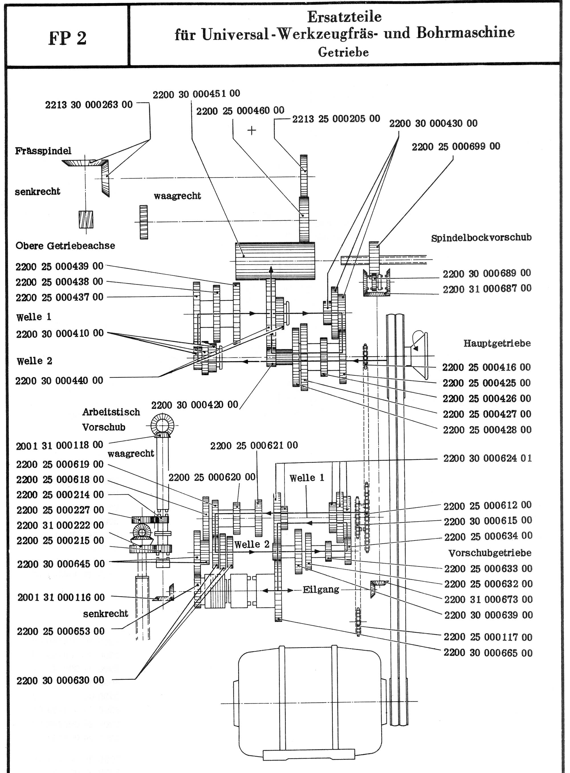 2. Кінематична схема фрезерного верстата Deckel FP2. Дивитись у збільшеному масштабі