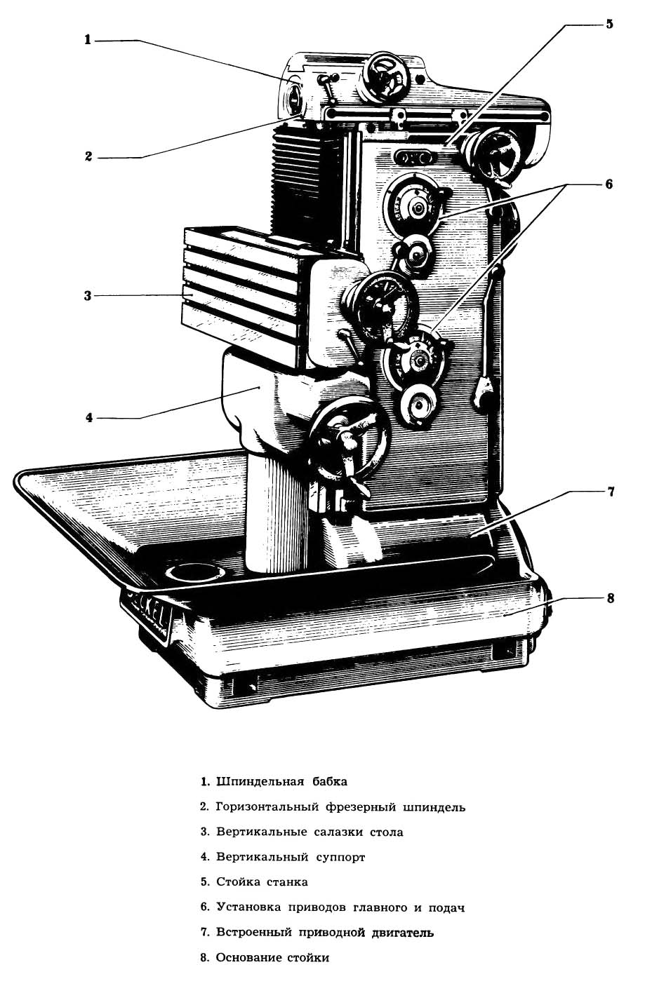 Маховичок 10 на защитном кожухе (на задньої стороне верстата) облегчает увімкнення шестерён при установці числа оборотів і швидкостей подачі, а также служит для обертання вручную фрезерного шпинделя.