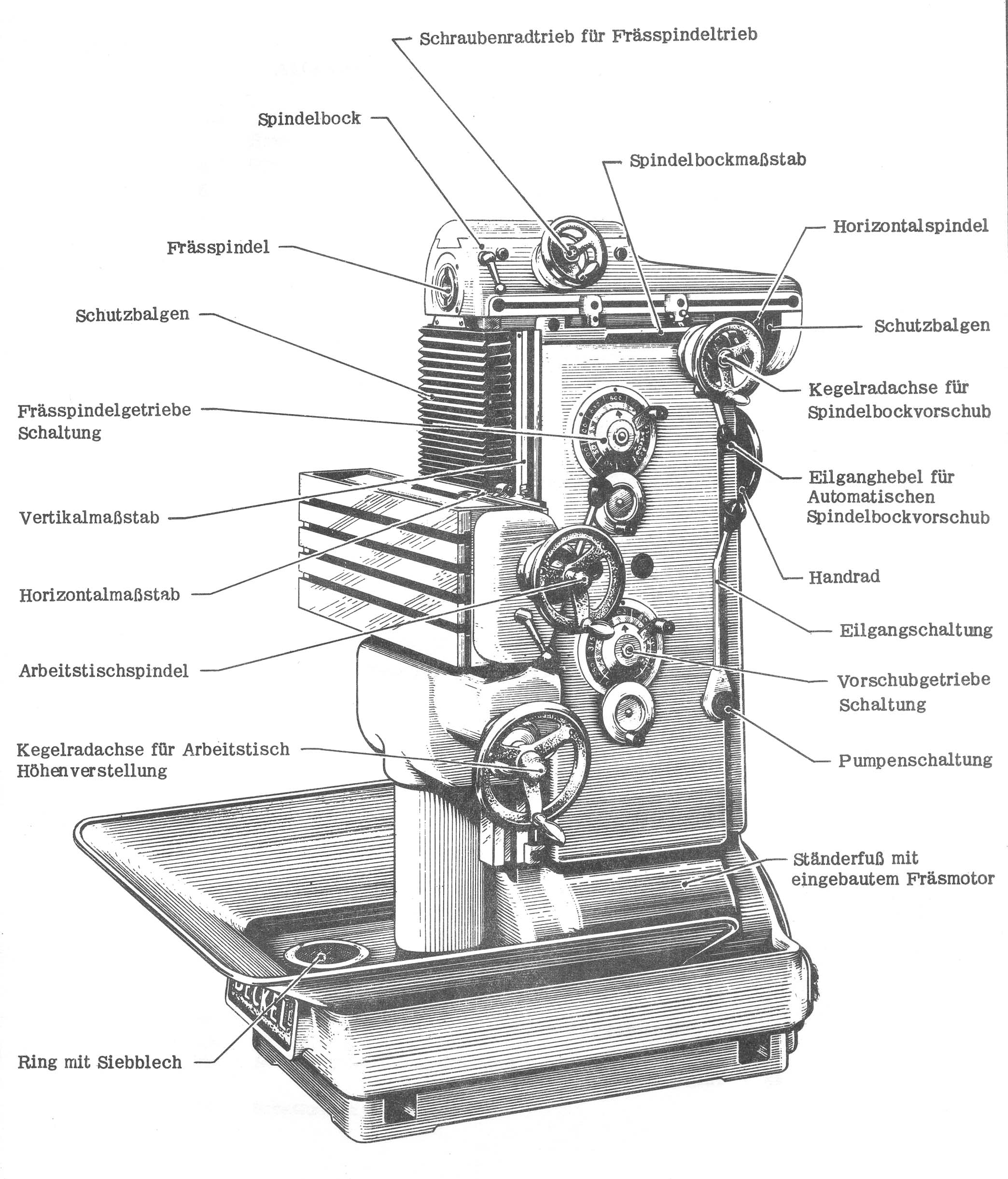 Установка упоров для вертикального переміщення суппорта производится на направляющей стойки со стороны дверцы, для продольного переміщення робочого стола — на нижней стороне робочого стола, а для переміщення шпиндельной бабки — на стойке со стороны дверцы. Во всех трёх случаях для ограничения ходу соответствующих ходовых винтов служат два внешних неподвижных упора. Два переставных упора могут устанавливаться в пределах етого максимального переміщення для желаемого ограничения пути подачі. Дополнительный упор по высоте 1 обеспечивает - особенно при вертикальном фрезеровании штампов - равномерную остановку фрезы у основания штампа (см. стр. 46, абз. 5).