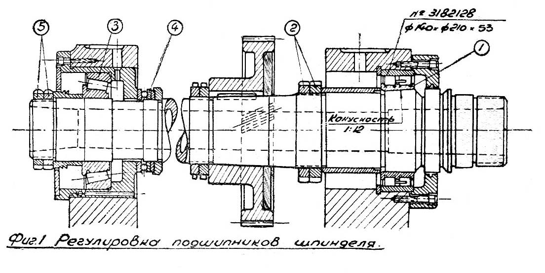 Передня конусная шейка шпинделя вращается в специальном регулируемом двухрядном роликовом подшипнике з цилиндрическими роликами. Для выборки люфта передний подшипник шпинделя регулируется изнутри передньої бабки путем подтяжки внутреннего кольца підшипника 1 з помощью гайки 2.