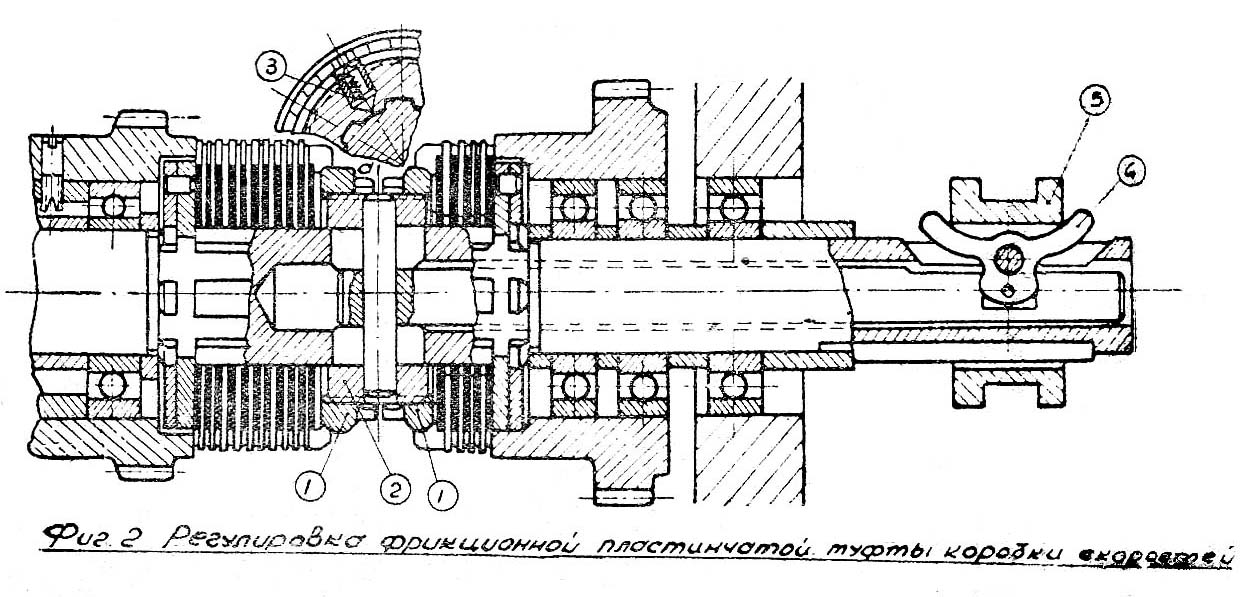 В случае буксования фрикционной муфты на рабочем ходу, она должна быть немедленно отрегулирована, т. к. от трения дисков сильно будет нагреваться і верстат не будет работать нормально. Регулювання фрикционной муфты производится нажимными гайками 1, навинченными на кольцо 2. Поворот нажимной гайки може быть произведен лишь після того, как защелка 3 вдавлена в кольцо 2. При включен ной муфте один из концов коромысла 4 дол жен находиться под горизонтальной плоскостью паза муфты переключения 5.