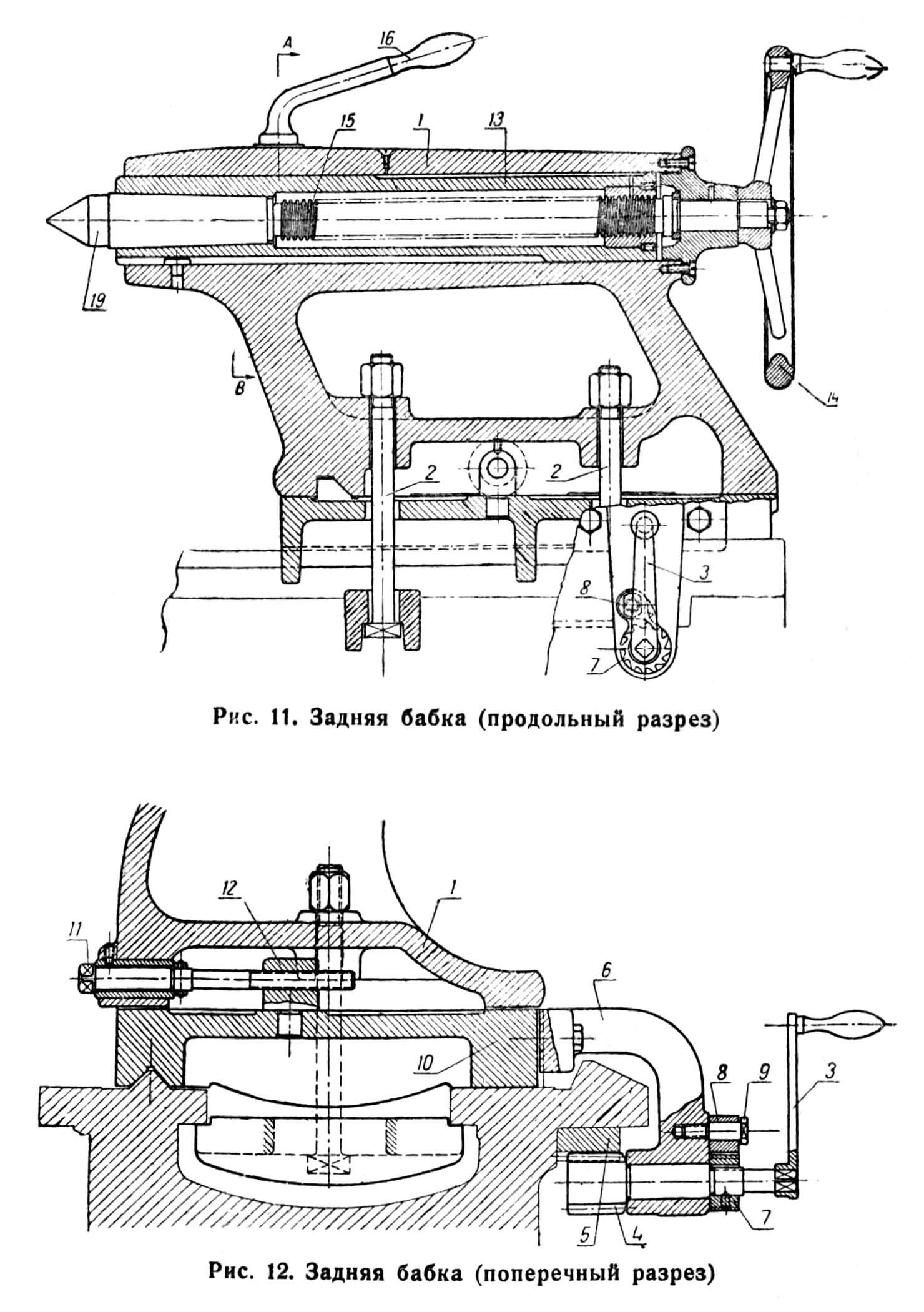 Поперечное перемещение осуществляется при помощи болта 11, закрепленного в корпусе задньої бабки, і гайки 12, закрепленной на мостике 10.