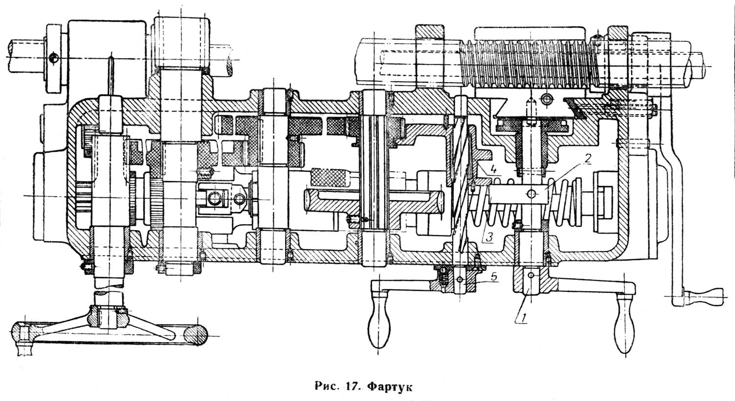 Червяк (Приподнимается і вводится в зацепление з червячной шестерней при помощи рукоятки 5 (рис. 22), расположенной на передньої стенке фартука.