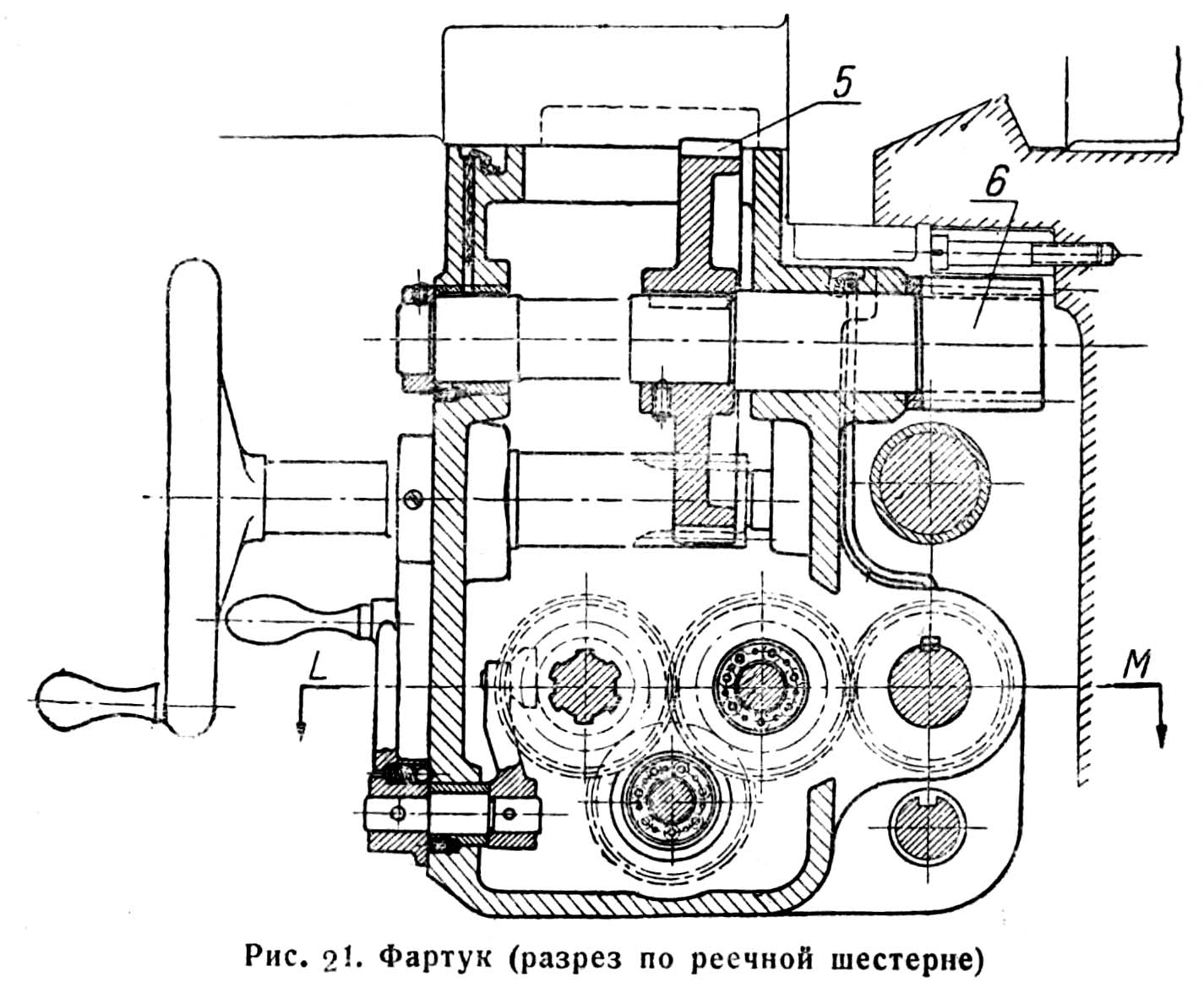 При поперечном самоходе (рис. 20) рух от червяка 1 передається червячной шестерне 2 і далее через шестерни 3 і 4 — на поперечний винт каретки. При включении продольного самохода шестерня 3 передвигается влево і вводится в зацепление з другой шестерней, передающей вращение шестерне 5 (рис. 21), сидящей на валике реечной шестерни 6.