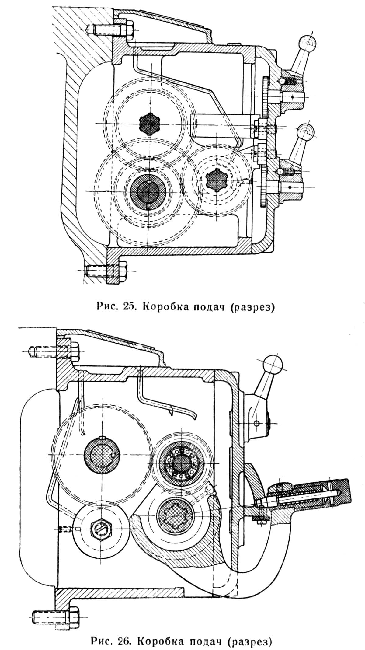Конструкція механізма коробки подач дает возможность путем переключения шестерен получить большое количество различных видов різьб і подач. Переключения производятся передвижением шестерен рычагами по шестишпоночньим валикам.