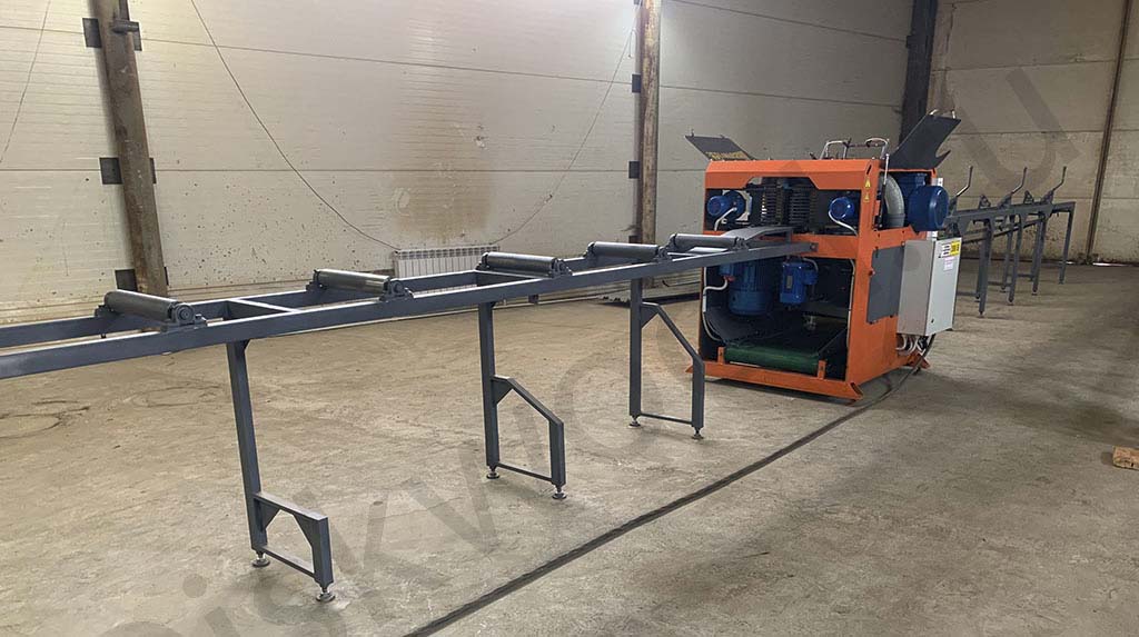 Полученный двухкантный брус (лафет) подаётся в многопильный узел двухвального типа.