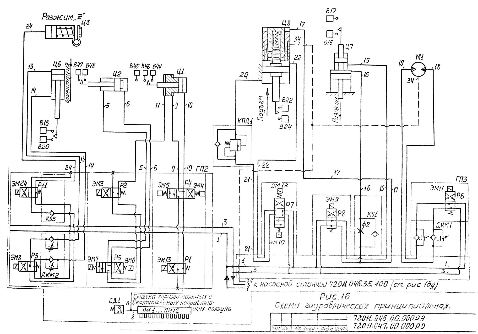 Гідравлічна схема бесконсольного вертикально-фрезерного верстата ФП-17. Дивитись у збільшеному масштабі