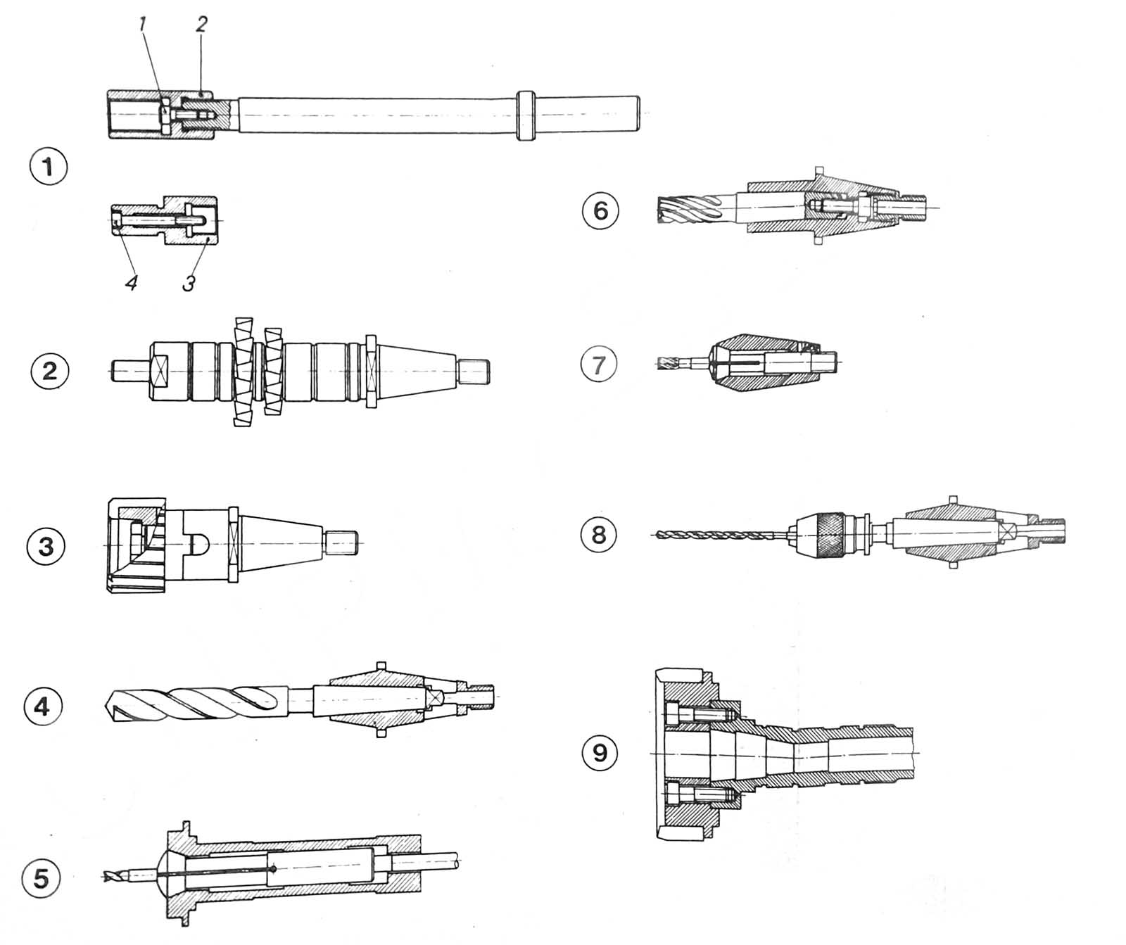 Инструменты могут закрепляться в шпинделе при посредстве следующих инструментальных державок: