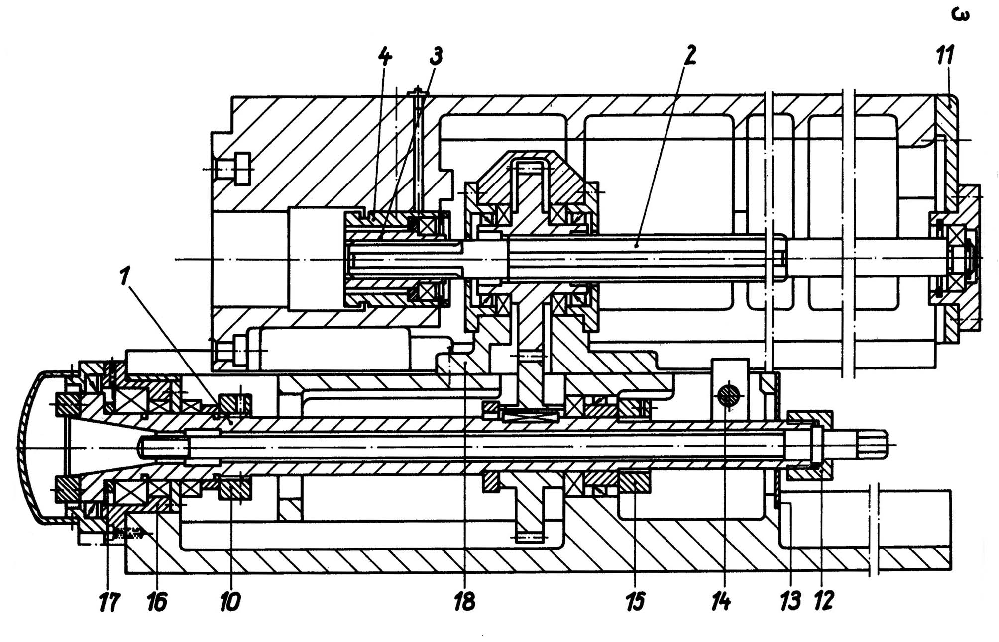 Привід осуществляется от головного двигуна I через двухступенчатую передачу на фрезерный шпиндель. При помощи двух електромагнітних дисковых муфт I і 2, рис. 2, осуществляется соответствующая ступень передачи.