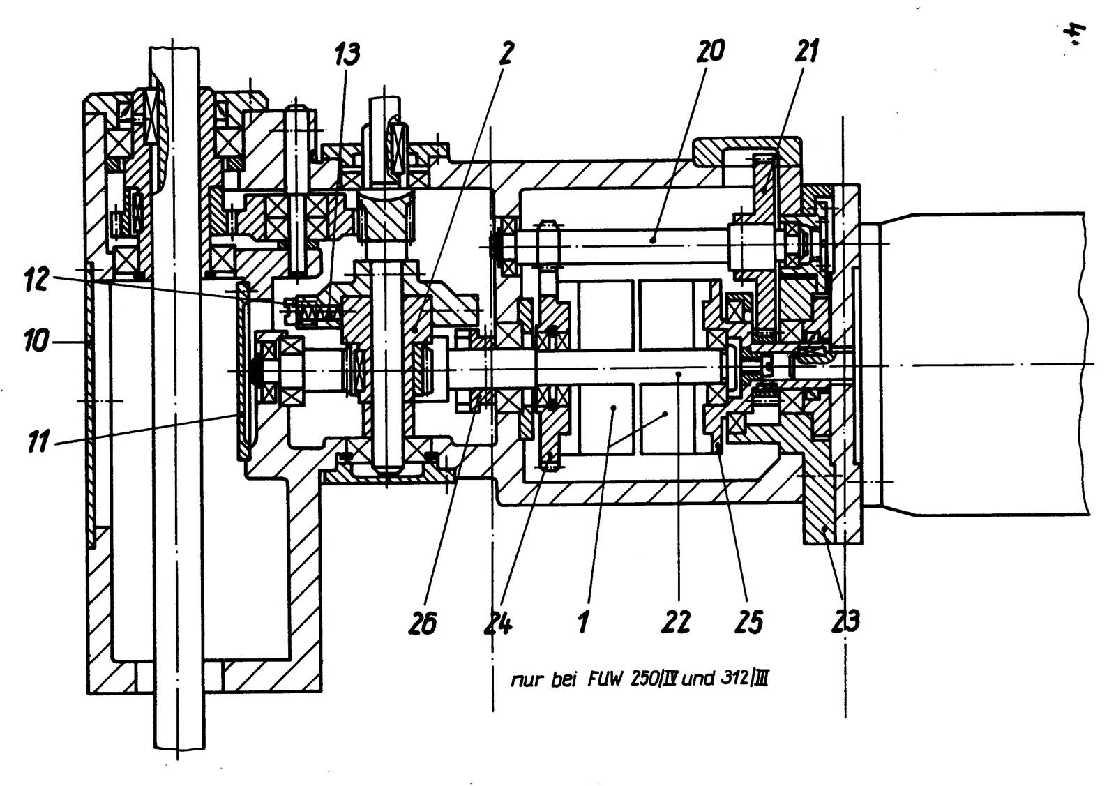 Коробка передач для подачі (рис. 4) выполнена в качестве вставной коробки передач і находится в нижней частини стойки. Подача по соответствующим координатным осям осуществляется через двухступенчатую шестерню і червячную передачу, а также через приводные валы, соотв. ходовой винт. Переключення з одной ступени передачи на другую осуществляется посредством електромагнитной дисковий муфты I, рис. 4. Предохранительная муфта 2, рис. 4, защищает коробку передач от перегрузки.