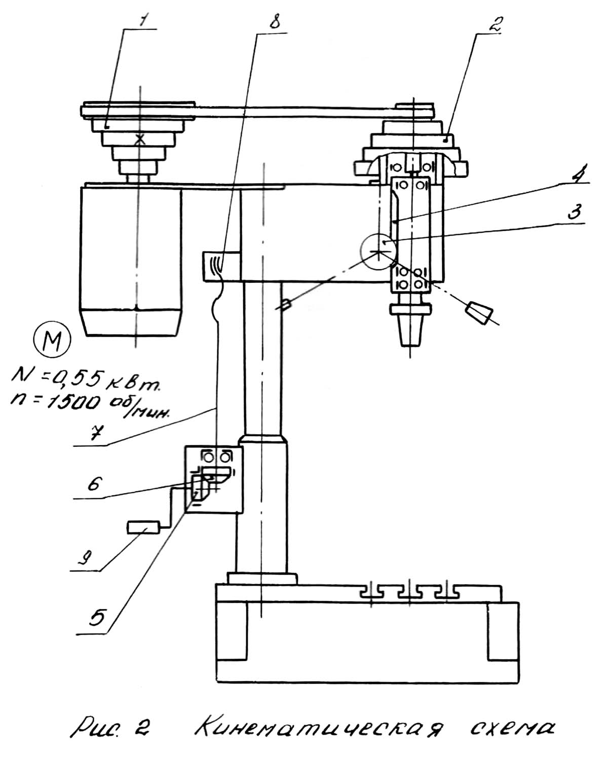 Вращение от електродвигуна М передається через ременную передачу на вал шпинделя.