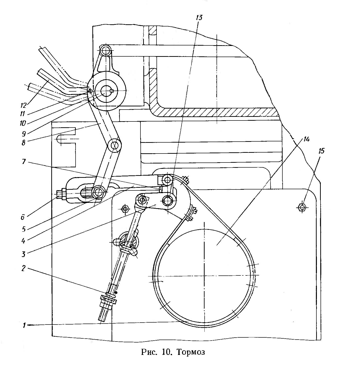 Тонкая регулировка затяжки тормозной ленты производится при помощи гвинта 6 з післядующим стопорением гайкой 5.