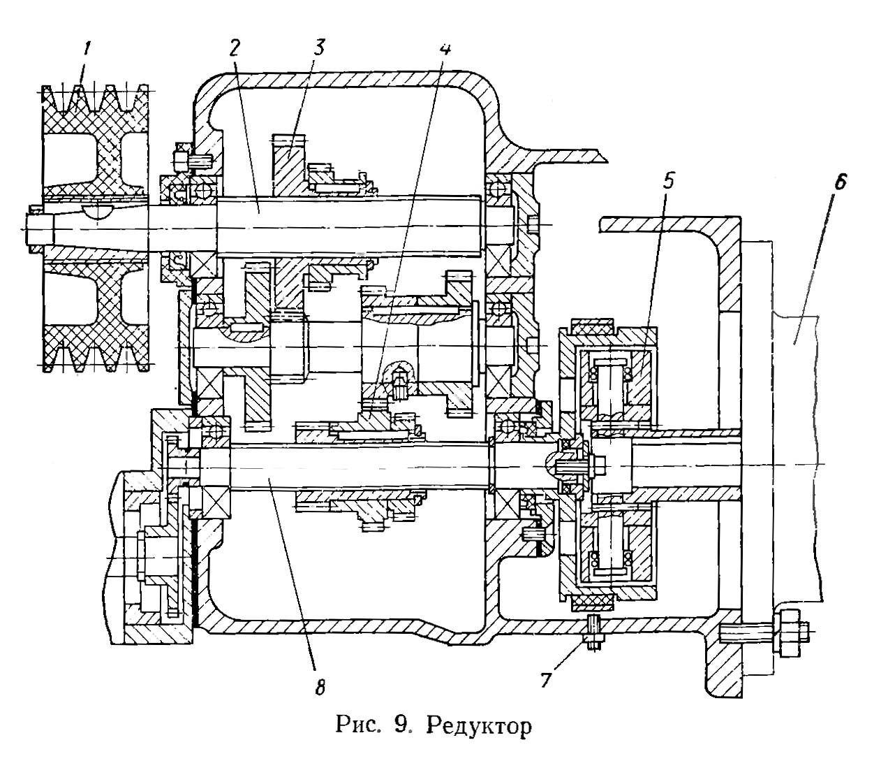 Рух от електродвигуна 6 (рис.9) через центробежную муфту 5 передається на первый вал 8 редуктора, на котором находится тройной блок шестерен 4. На валу 2 находится подвижной двойной блок шестерен 3, а на кінці вала укреплен трехручьевой шкив 1.