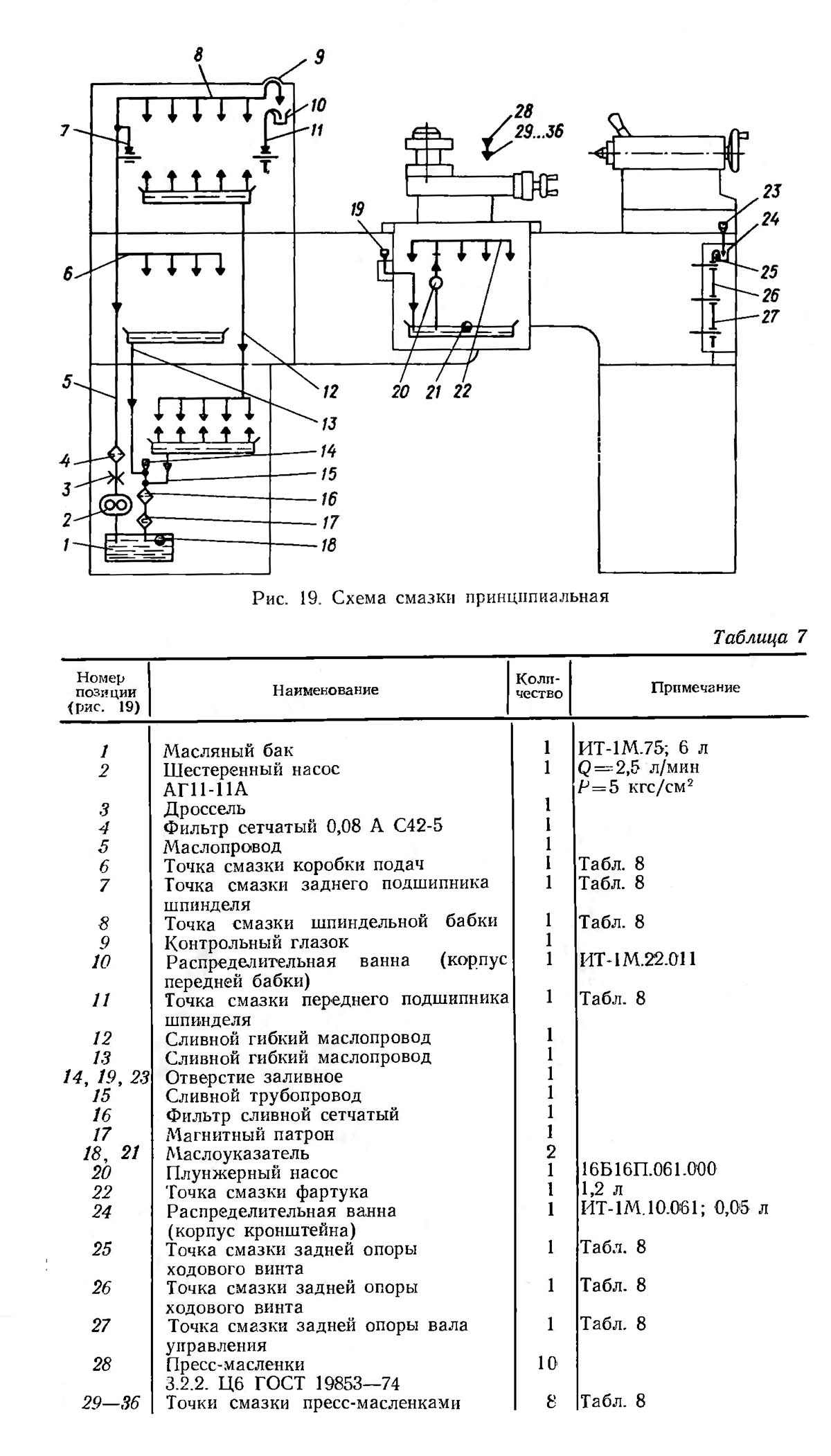 Перед пуском верстата необходимо через заливные отверстия заполнить масляный резервуар, масляную ванну в корпусе фартука і масляную ванну в заднем кронштейне маслом соответствующего сорта в количестве, указанном в табл. 7. Масло заливать через лейку з фильтровальной сеткой: сетка 24 ГОСТ 3187—65.