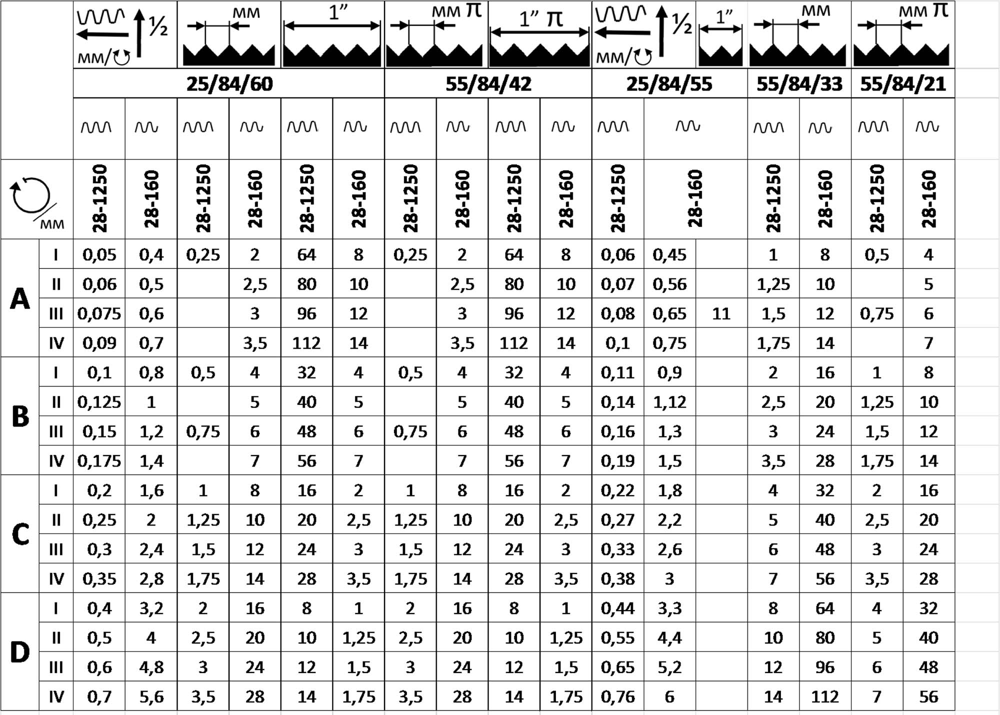 Таблиця різьб токарно-гвинторізного верстата ИТ-1М. Скачать в увеличенном масштабе