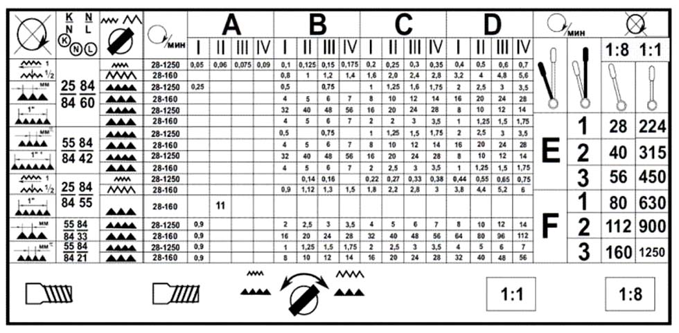 Налаштування необходимой частоти обертання шпинделя і данные для налаштування различных подач при точении і нарезании різьб приведены в разделе «Паспорт», а также в таблице, укрепленной на передньої бабке. В таблице приведен і набор сменных шестерен при нарезке резьб.