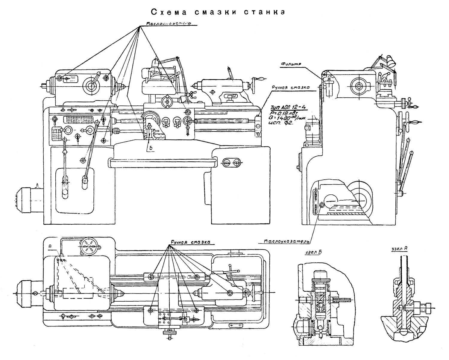 Коробка подач і редуктор смазываются разбрызгиванием масла. Перед пуском верстата резервуары коробки подач, редуктора, фартука, а также левой тумбы должны быть наполнены: