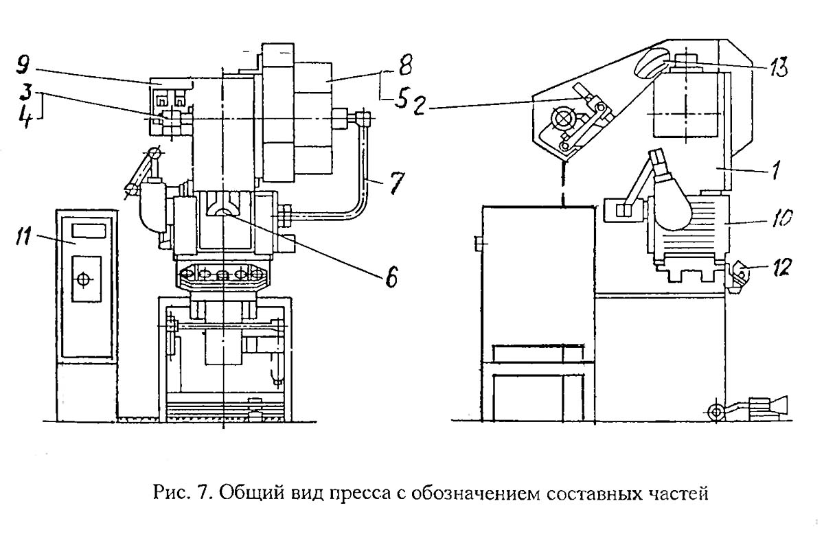 В нижней частини станины крепится наклонный склиз 7 для удаления штампованных деталей или отходов.