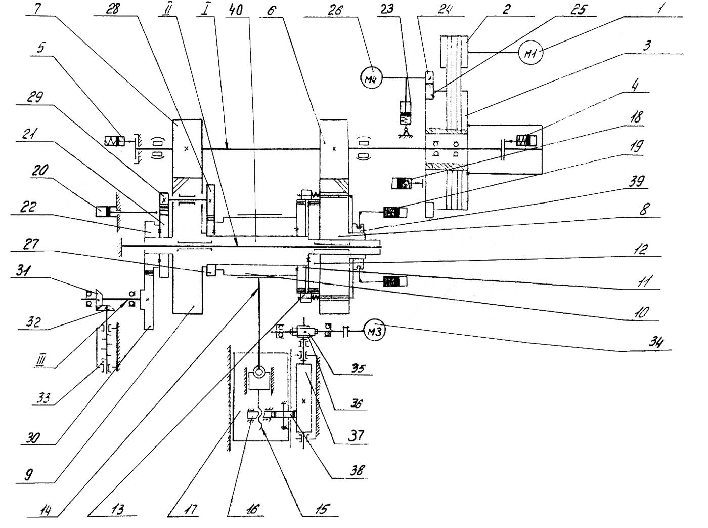 Крутящий момент електродвигуна М1 через шкив 1 передається на маховик 2 і далее при включенной муфте 3 і выключенном тормозе 4 – на приемный вал 1, на котором закреплены шестерни 5 і 6.