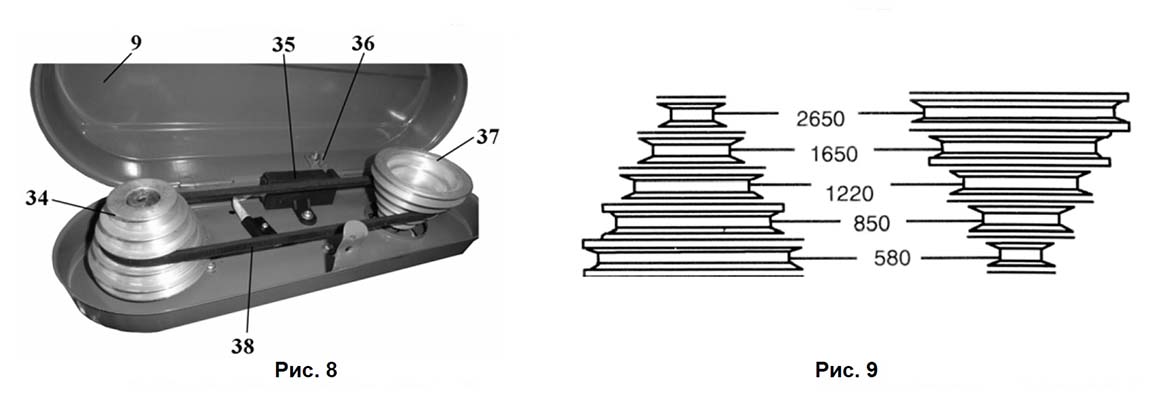 Скорость обертання шпинделя регулируется изменением положения клинового ремня (38) на ручьях шкивов (34 і 37), Рис.8, 9. Можно установить 5 режимов частоти обертання шпинделя, Рис.9. Для изменения режима обертання шпинделя предварительно следует ослабить натяжение клинового ремня (38), Рис.8.