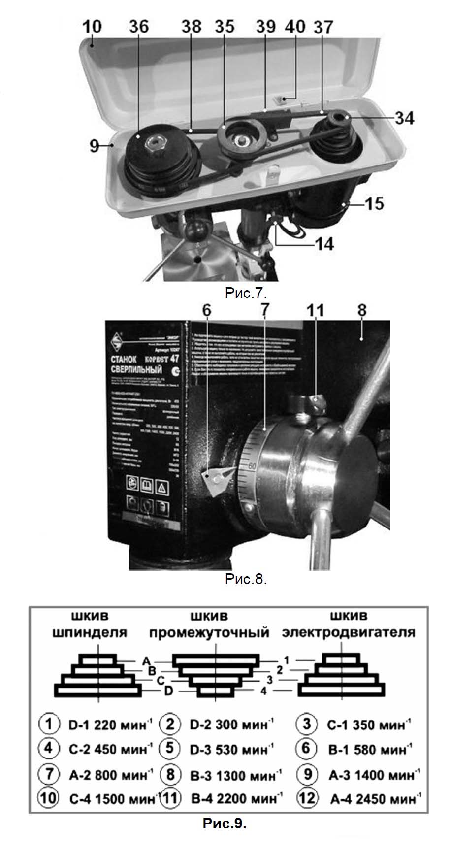 Для изменения скорости обертання шпинделя предварительно следует ослабить натяжение клиновых ремней (37) і (38). Для етого необходимо ослабить винты фиксации (14), расположенные симметрично з двух сторон шпиндельной головки верстата (8), Рис.2,4,7. Затем переместите електродвигатель (15) в сторону режущего инструмента, Рис.7. Руководствуясь данными, указанными на Рис.9, необходимо установить ремни (37) і (38) на ступенях шкивов (34), (35) і (36) в требуемые позиции, Рис.7.