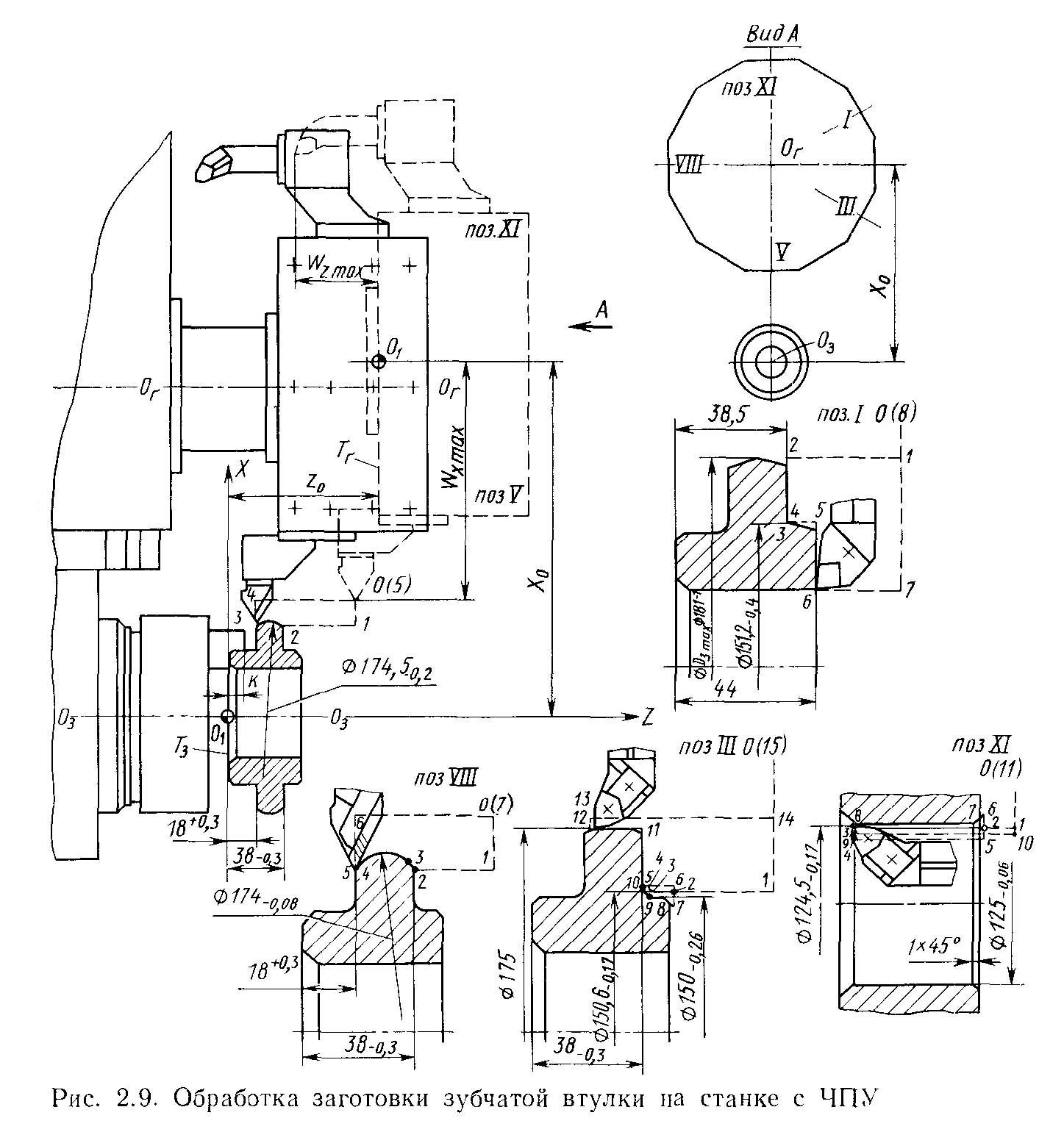 Исходное положение инструмента каждой позиции, т. е. положение нулевой точки его траектории, характеризуется координатами X0 і Z0. Размерная связь обрабатываемой заготовки з резцовой головкой і режущими инструментами осуществляется через расстояния X0 между осью шпинделя з заготовкой O3—O3 і осью обертання головки Oг—Oг (размер по оси X) і расстоянием Z0 от базового торца заготовки T3 до переднего (базового) торца Tv резцовой головки (размер по оси Z). Точка пересечения оси поворота Or—Or з торцовой плоскостью Tr в исходном положении определяет нулевую точку О, системы (нуль системы).