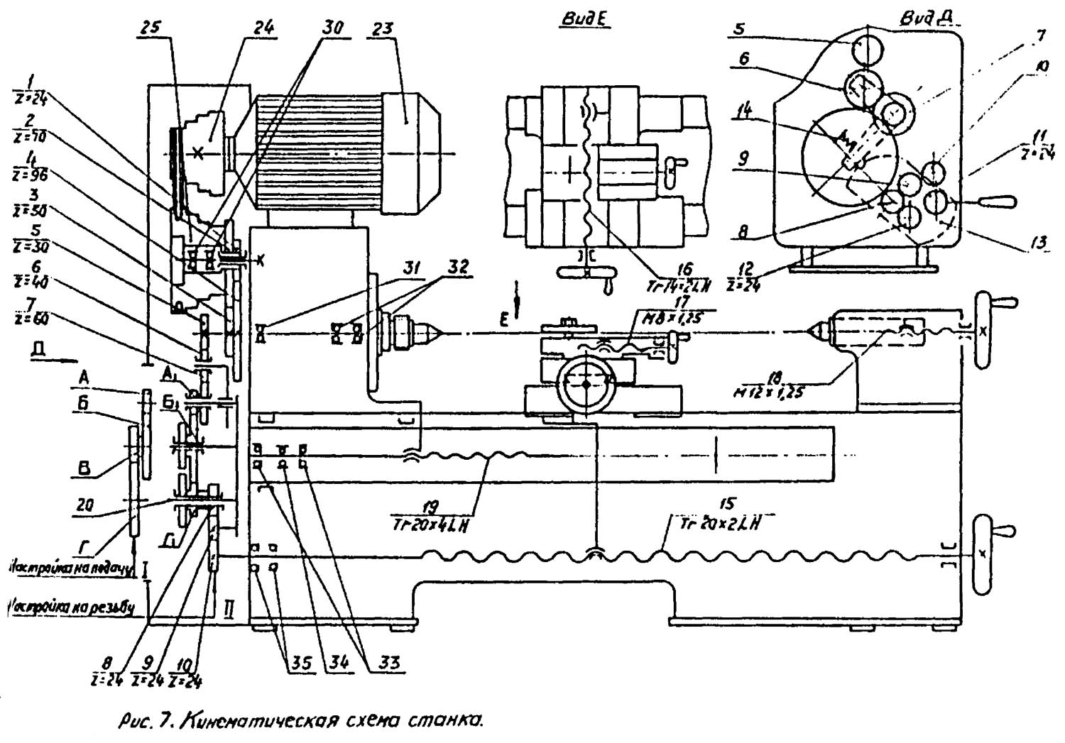 Схема кінематична токарно-гвинторізного верстата МК-3002. Завантажити у збільшеному масштабі