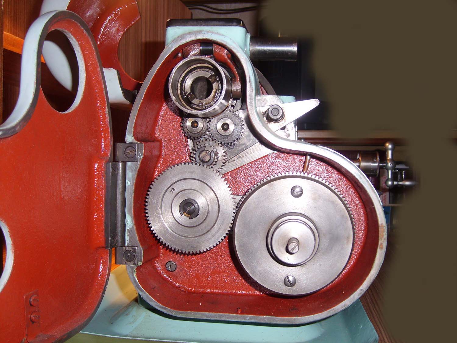 Якщо проводиться нарізування такого різьблення, де колесо D НЕ має 100 зубів, то послабити аретирувальний гвинт 1 і висунути планетарну передачу. У паз у валу вставити шпонку, що входить в об'єм приладдя верстата, і замість планетарної передачі посадити відповідне змінне колесо, яке слід зафіксувати розпірним кільцем і гвинтом D. Гітару змінних коліс 56