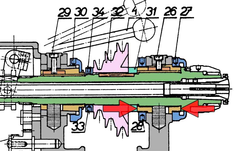 Осьовий тиск шпинделя виробу сприймається на торцевих поверхнях бронзового вкладиша переднього підшипника з одного боку буртиком на шпинделі, а ззаду - фрикційним кільцем 31. У разі зносу поверхонь тертя та утворення шкідливого зазору, послабити гвинт 34 і за допомогою гайки можна було вручну обертати шпиндель без надмірних зусиль. Під час налагодження слідкувати за тим, щоб у порожнину між фрикційним кільцем та поверхнею тертя підшипника не потрапили забруднення.