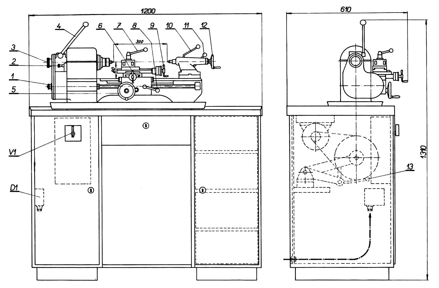 Шпиндель виробу має 9 ступенів числа обертів у межах від 150 до 2000 об/хв. Швидкість шпинделя можна легко змінювати перебором шківів та клиноподібного ременя. Електродвигун, шківи та електроустаткування розміщені у лівій частинині столу, на якому встановлено токарний верстат. Шпиндельна бабка із шпинделем на підшипниках ковзання оснащена цанговим затискним пристроєм пруткового матеріалу, а також кріпленнями кільцевих заготовок за зовнішні та внутрішні діаметри.