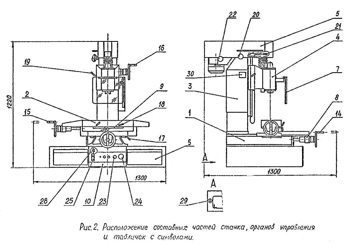 Розташування органів керування фрезерним верстатом МС-51. Дивитись у збільшеному масштабі