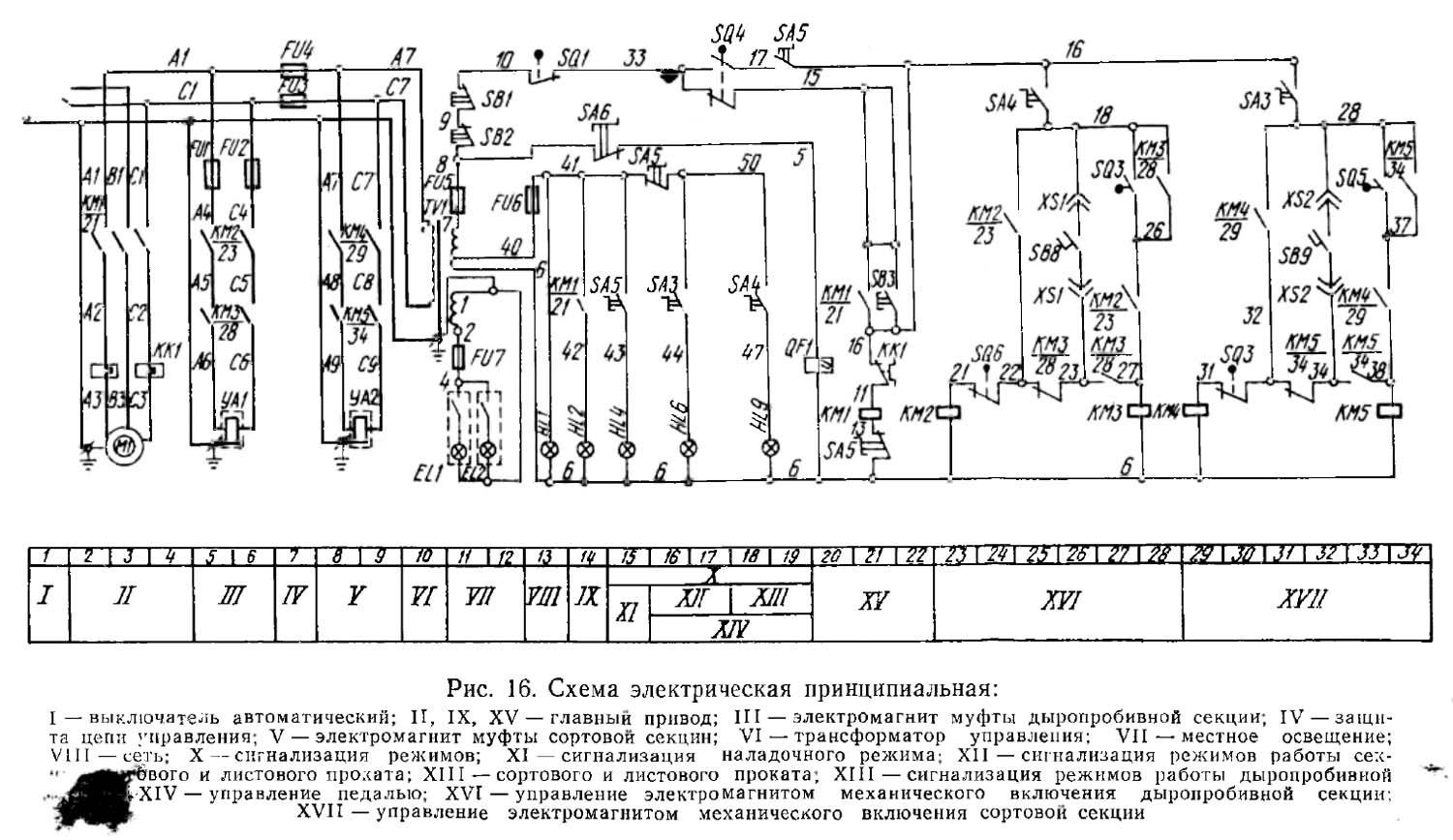 Електросхема (рис. 16) комбинированных пресс-ножниц предназначена для керування двумя секциями в следующих режимах: