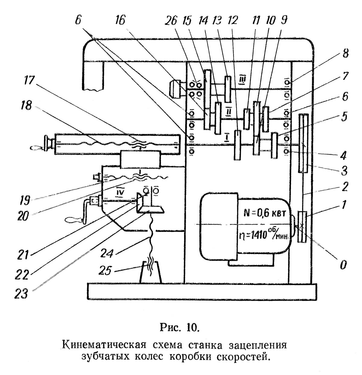 Вращение от електродвигуна I передається клиноременной передачей валу II коробки швидкостей (рис. 7). Далее з вала II. на вал III і затем на шпиндель IV вращение передається через шестерни 4, 5, 6, нерухомо закрепленные на валу II, подвижные тройной і двойной блоки шестерен, сидящие на валу III і шестерни 12, 13 нерухомо закрепленные/на шпинделе IV.
