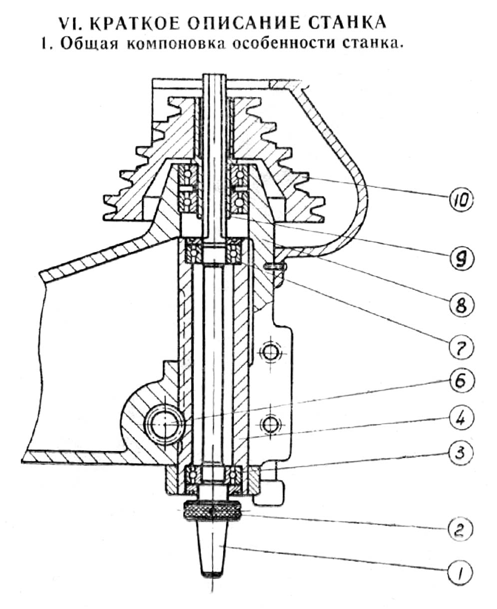 Шпиндельный узел изображен на рис. 5, смонтирован в корпусе 8. Сам шпиндель 1 смонтирован в гильзе 4 на шарикопідшипниках 3 і 7. Вращение шпиндель получает от втулки 9 і шкива 10 через шлицевое соединение.