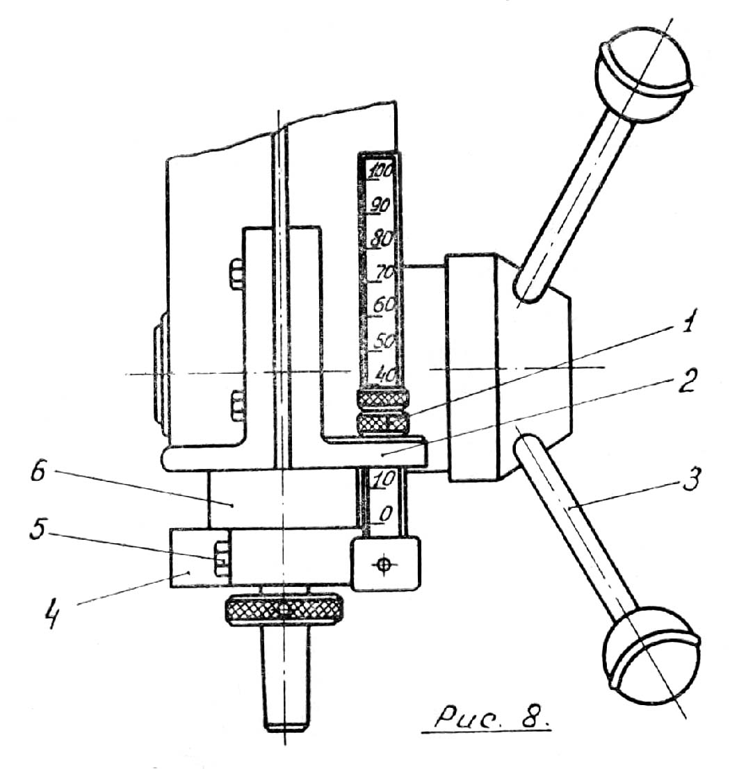 На рис. 8 изображена шкала переміщення шпинделя. При сверлении отверстий на заданную глубину можно пользоваться упором.