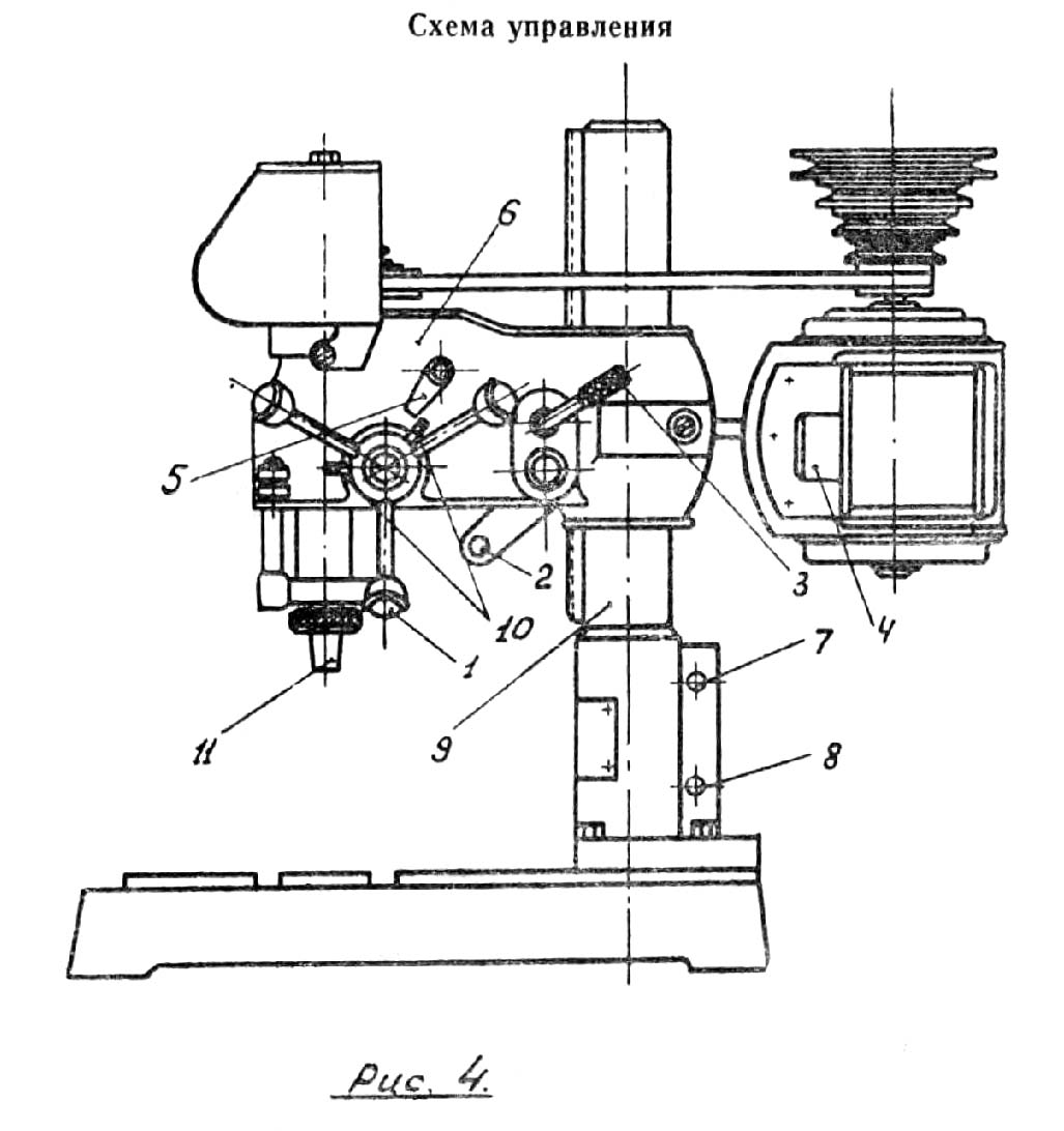 г) провернуть штурвал на величину длинны нарезки по шкале і установить один кулачек 10 (рис. 4) на ступице штурвала плотно к рычагу 5 (рис.4) з правой стороны, після чего болт кулачка 10 зажать. Это положение, когда метчик нарежет резьбу на заданную глубину і микропереключатель 4 (рис. 7) переключит електродвигатель на левое вращение;