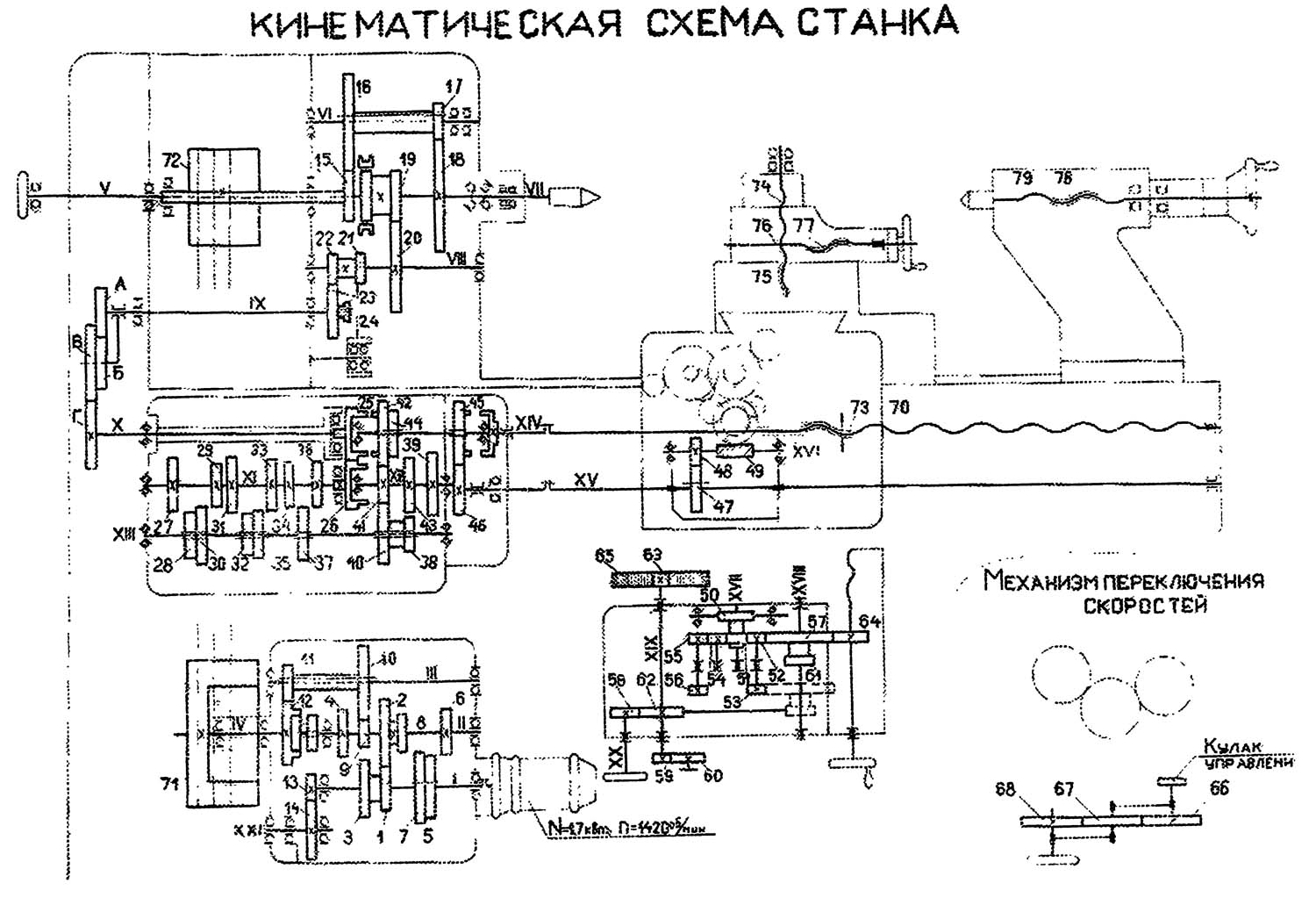 Схема кінематична токарно-гвинторізного верстата ВІД-4. Дивитись у збільшеному масштабі