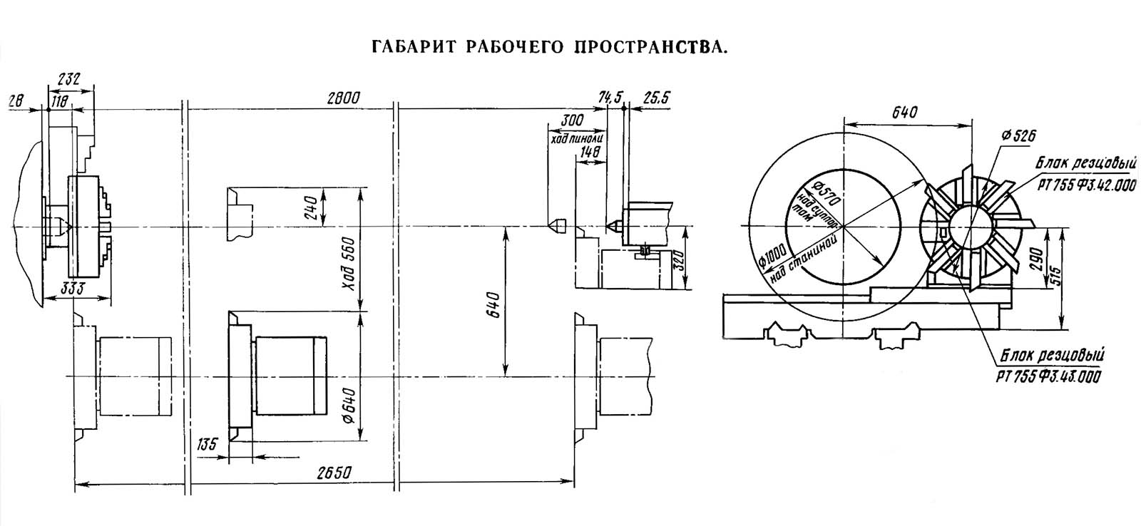 Габарит робочого простору токарного верстата з ЧПУ РТ755Ф3. Дивитись у збільшеному масштабі
