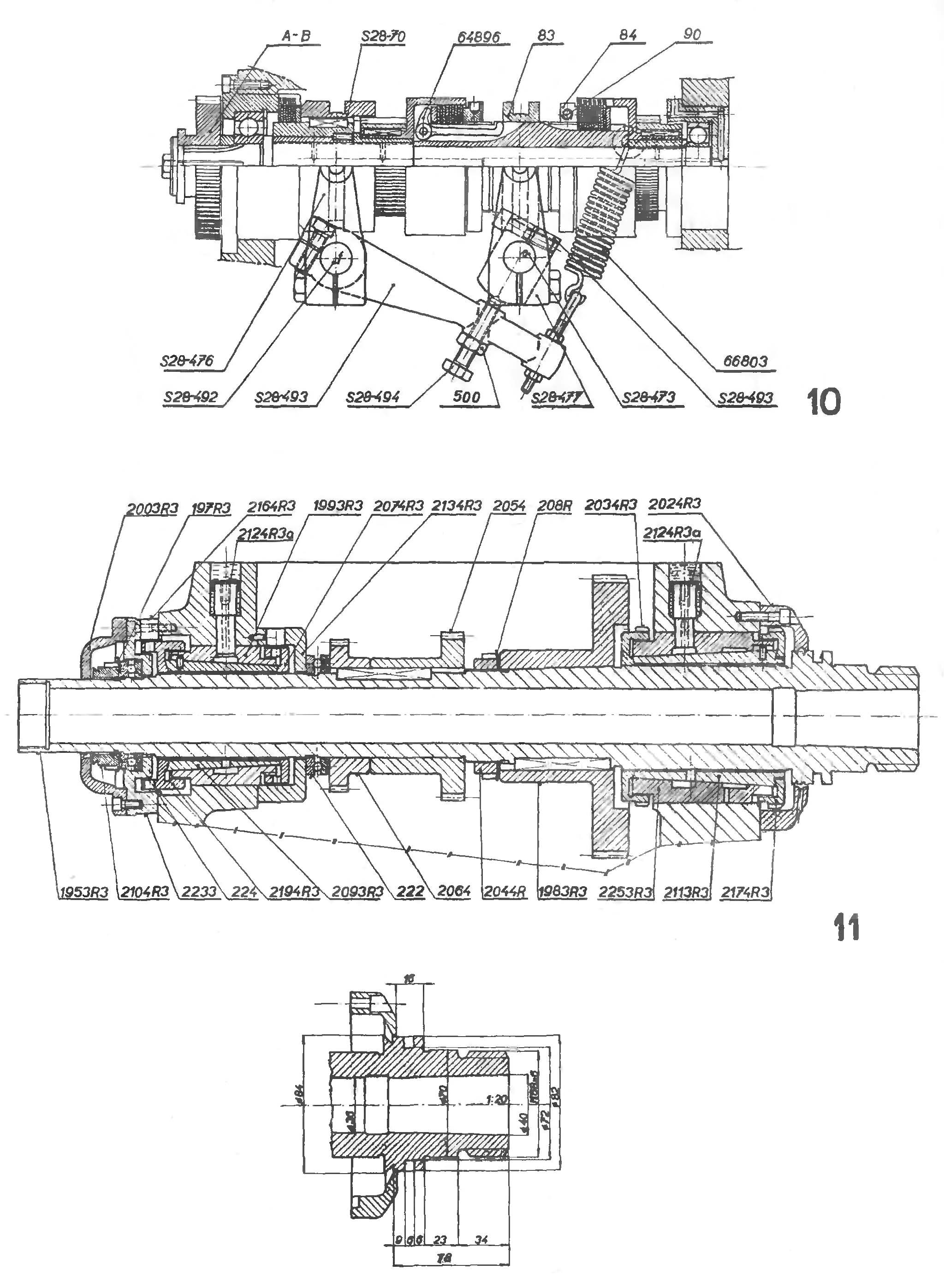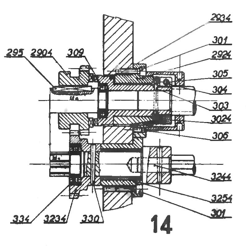 Регулювання зазору виконується в такий спосіб /Мал. 5/ Доступ до настановних гайок відкритий після зняття кришки шпиндельної бабки, видаливши передню та задню кришку шпинделя № рис. 2024 R3 та 2003 R3 та знявши шпонку 2164 R3 на задньому підшипнику.