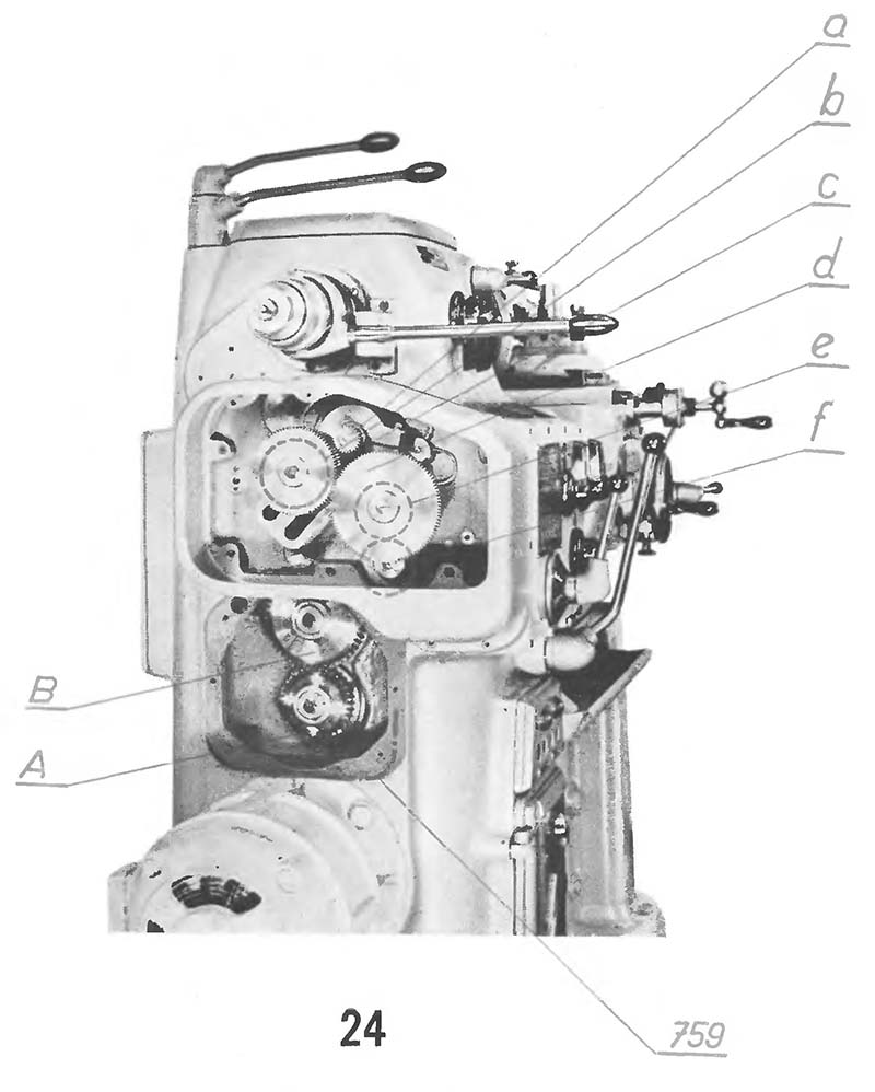 Привід верстата здійснюється від фланцевого електродвигуна, який за допомогою дискової муфти рухає змінні шестерні А, В /рис.24/ і вал муфти, з двома пластинчастиними муфтами доступними після видалення задньої кришки.