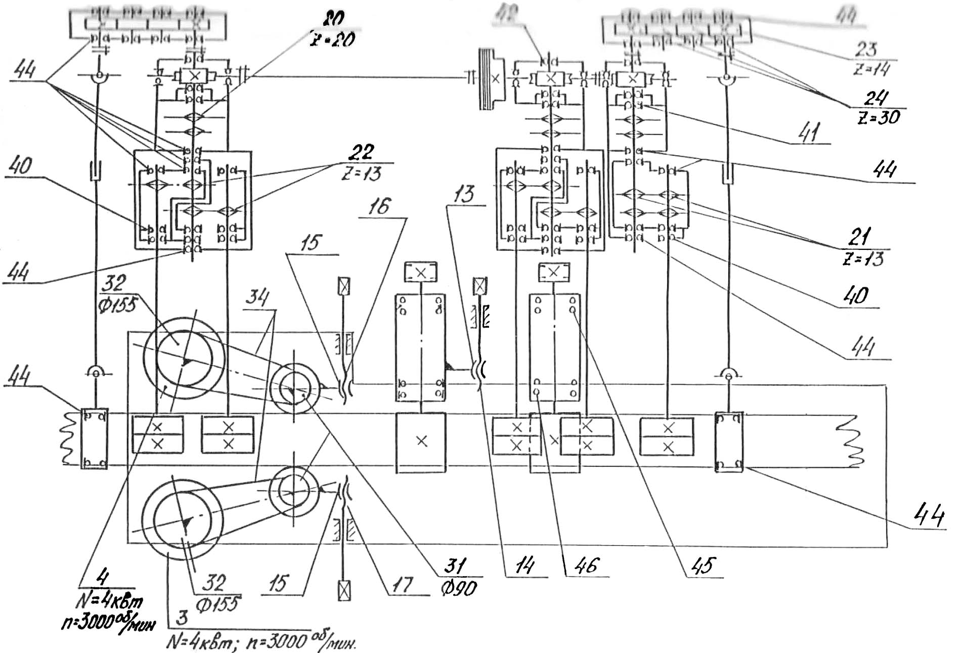 Кінематична схема четырехстороннего продольно-фрезерного верстата С16-42. Дивитись у збільшеному масштабі