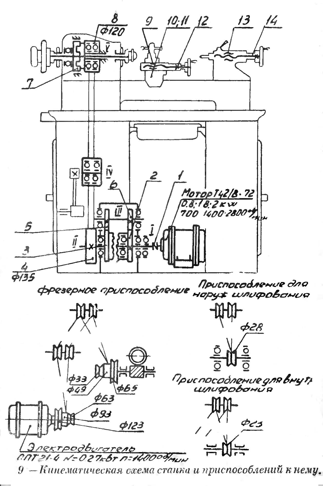 Переміщення на один поділ лімба (№ 9) – 0,02 мм. Шпиндель приводиться у обертання за допомогою круглого ременя від електродвигуна через контрпривід пристосувань.