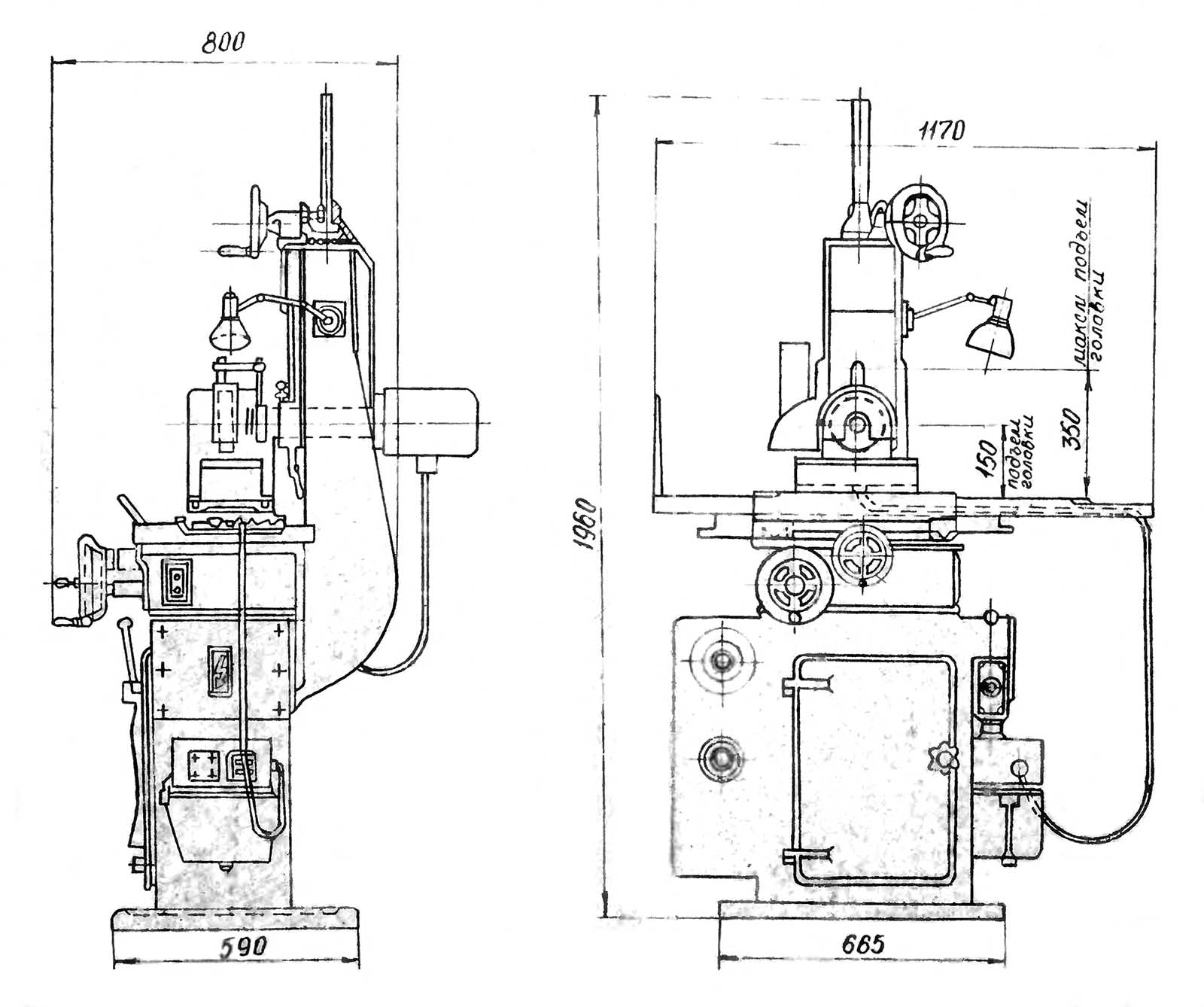 Шліфувальна головка (рис. 2) жорстко кріпиться до траверси стійки і переміщається у вертикальному напрямку вручну по направляючих стійки за допомогою точного ггвинта та маховичка, на якому нанесені поділки ціною 0,01 мм.