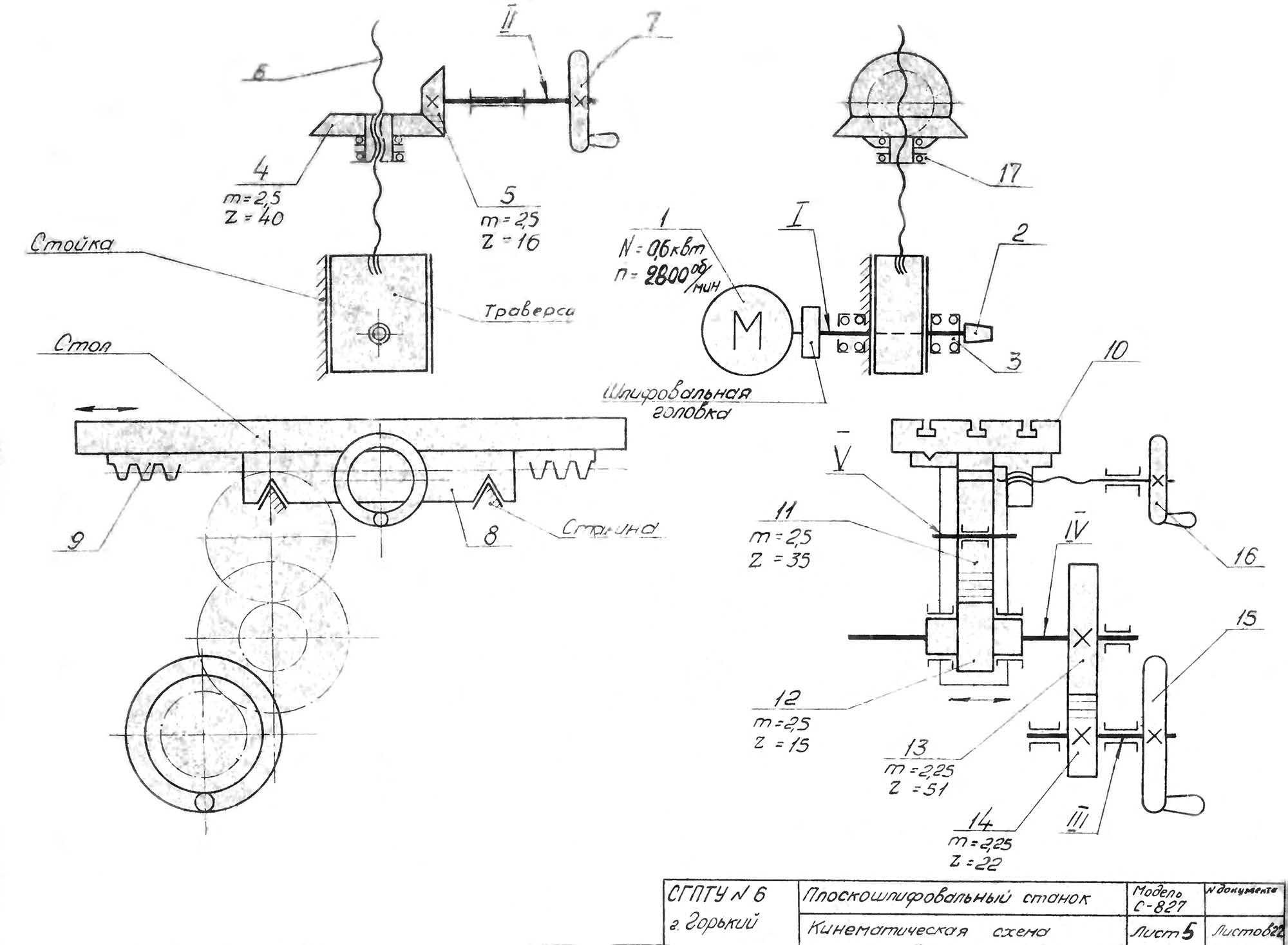 Схема кінематична плоскошліфувального верстата С-827. Дивитись у збільшеному масштабі