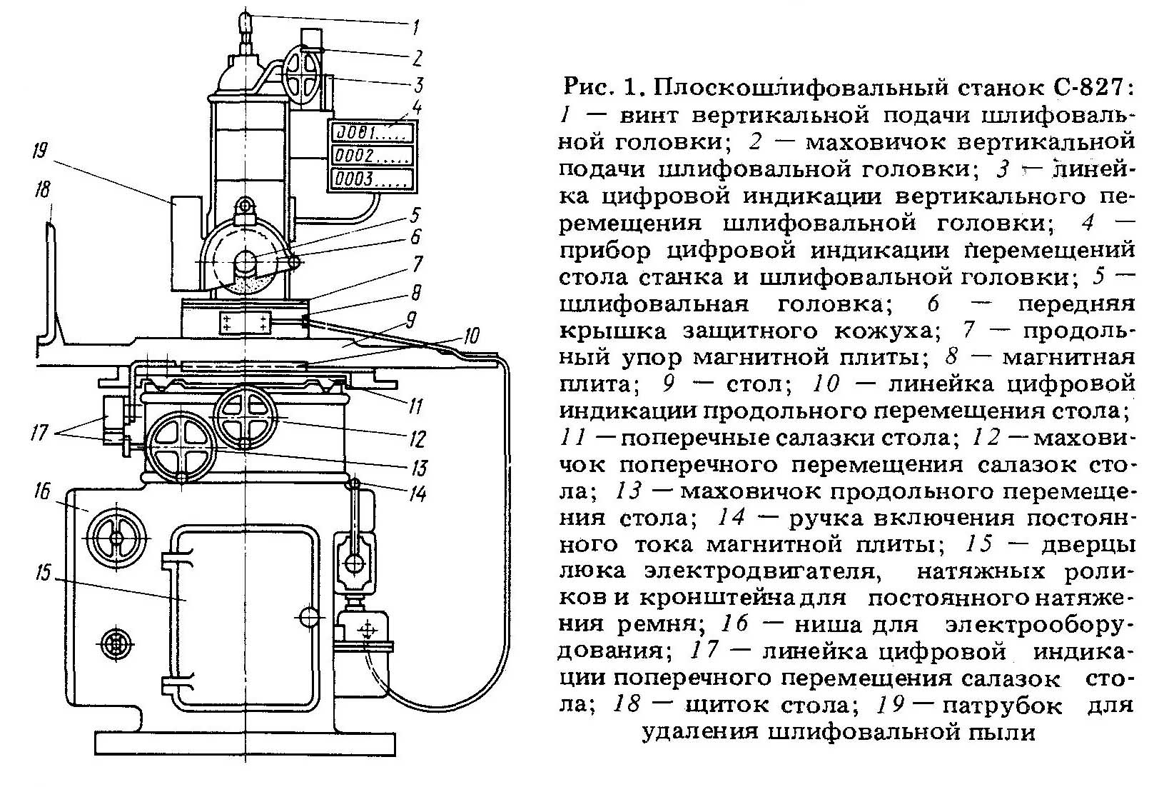 Плоскошліфувальний верстат С-827 складається зі станини в зборі, столу, санок, стійки, шліфувальної головки, електроустаткування та магнітної плити.