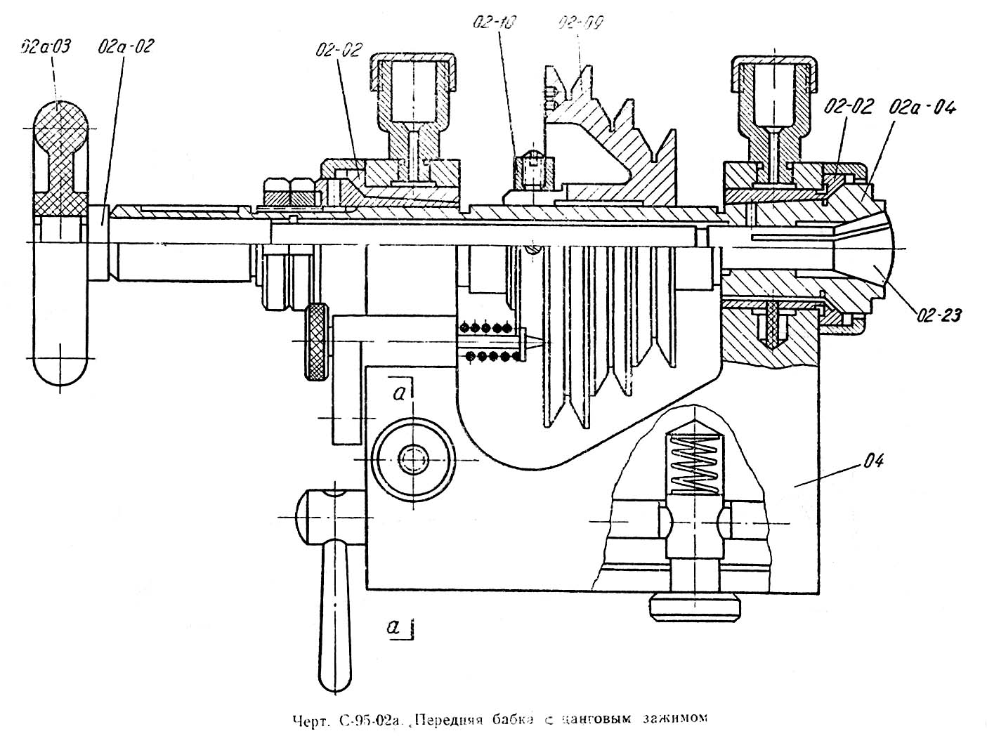 Передня бабка токарного верстата С-95 представляє вільчасту стійку (деталь 04) зі сталевими розжареними конічними втулками (деталь 02-02). Шпиндель (деталь 02-04) має гніздо під цангу або оправку. Регулювання шпинделя провадиться шляхом підтяжки заднього конуса. Змащення шпинделя з кільцевих кишень у бабці проводиться через отвори у втулках із встановленими в них фільтрами із фетру. Шків (деталь 02-09) між опорами шпинделя заклинений стопорним кільцем (деталь 02-10). Кріплення цанги (деталь 02-23) проводиться за допомогою цангоутримувача (деталь 02а-02) та маховичка (деталь 02а-03).