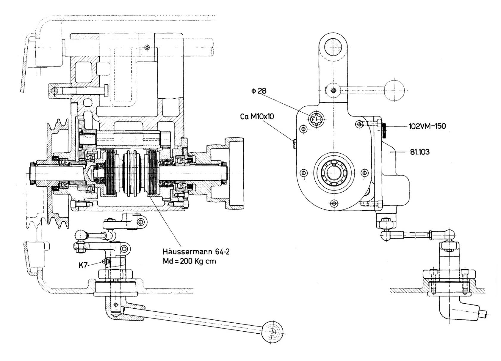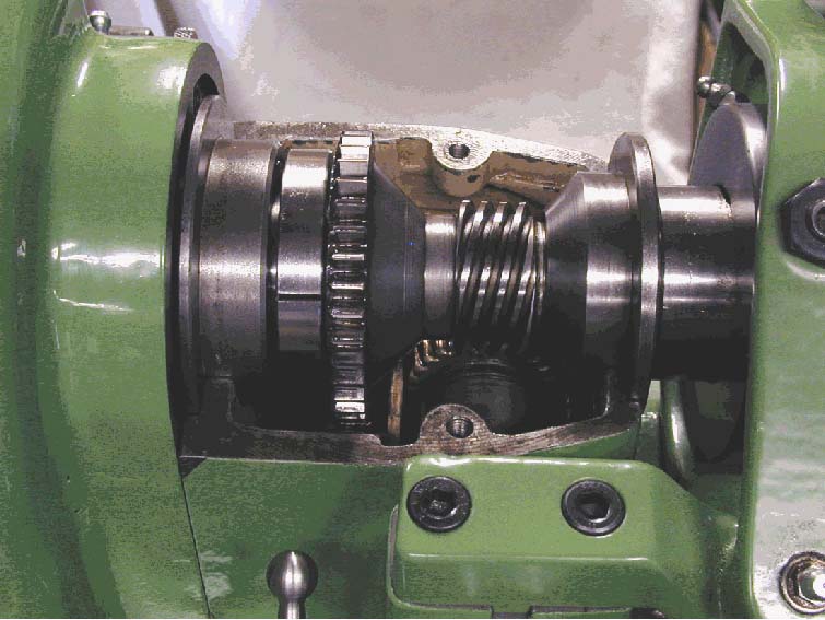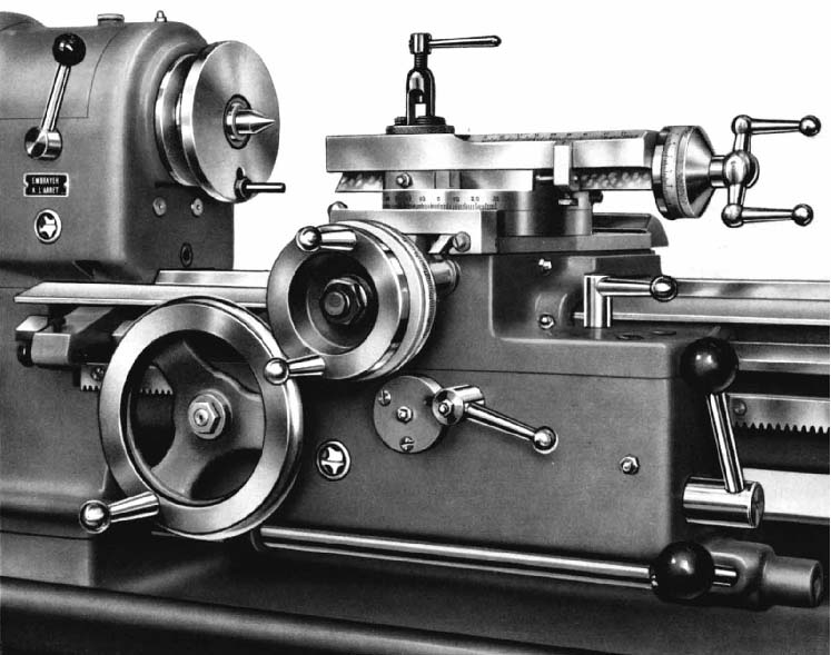Одним з великих покращень порівняно з 102-VM, що пропонується новою моделлю, стала наявність коробки передач (праворуч). Цей акуратний вузол, встановлений під передньою бабкою в передній частинині станини, мав ремінний привід від шпинделя і мав єдину ручку регулювання з накаткою, що забезпечує вісім швидкостей подачі від 0,02 до 0,3 мм на оборот шпинделя. Швидкість подачі можна було регулювати під час роботи машини та подачі, що являло собою величезний виграш у зручності порівняно з більш ранньою машиною.